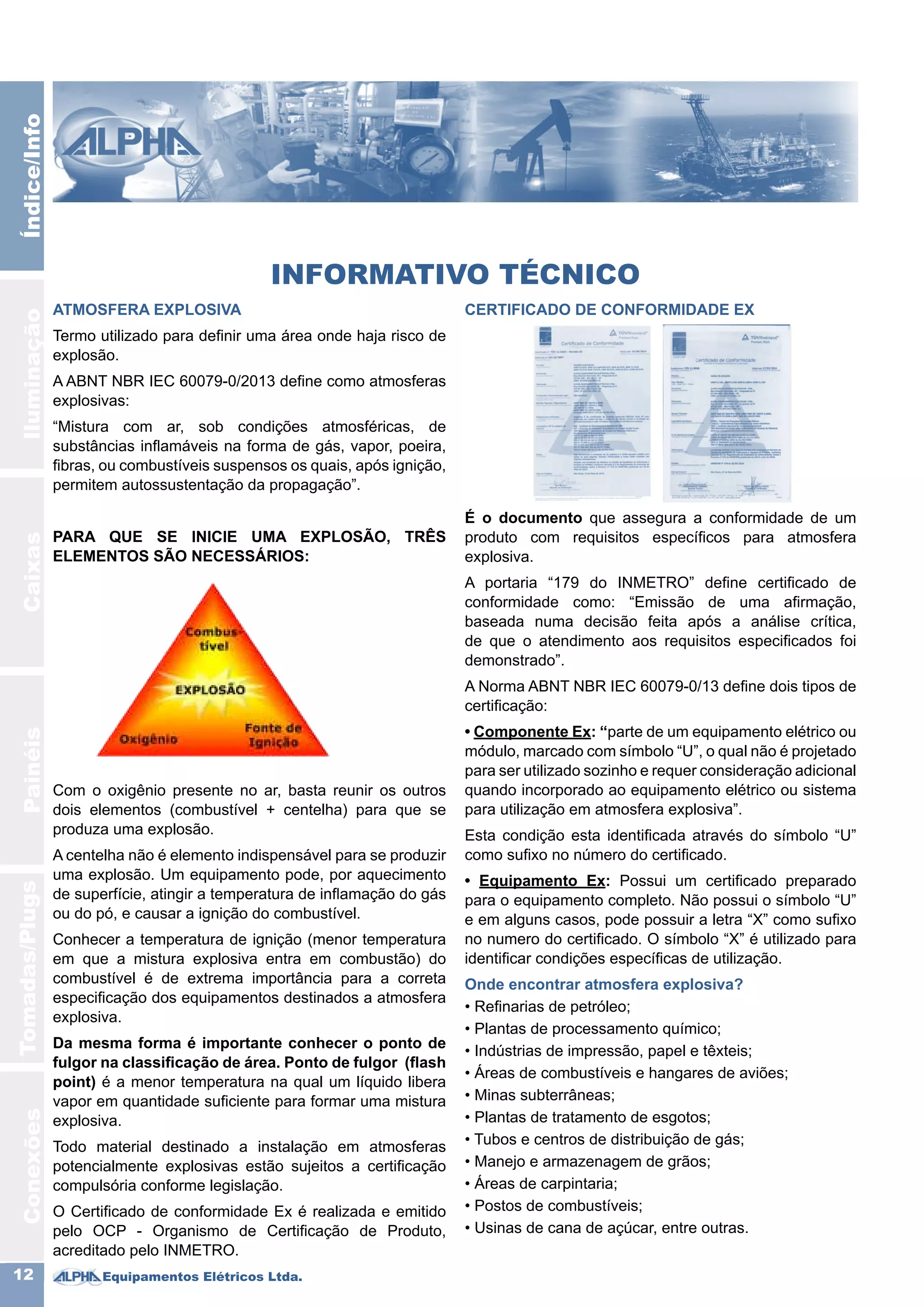 1) O documento discute atmosferas explosivas e fornece informações sobre classificação de zonas de risco, tipos de equipamentos elétricos para diferentes grupos de gases e poeiras, e níveis de proteção.