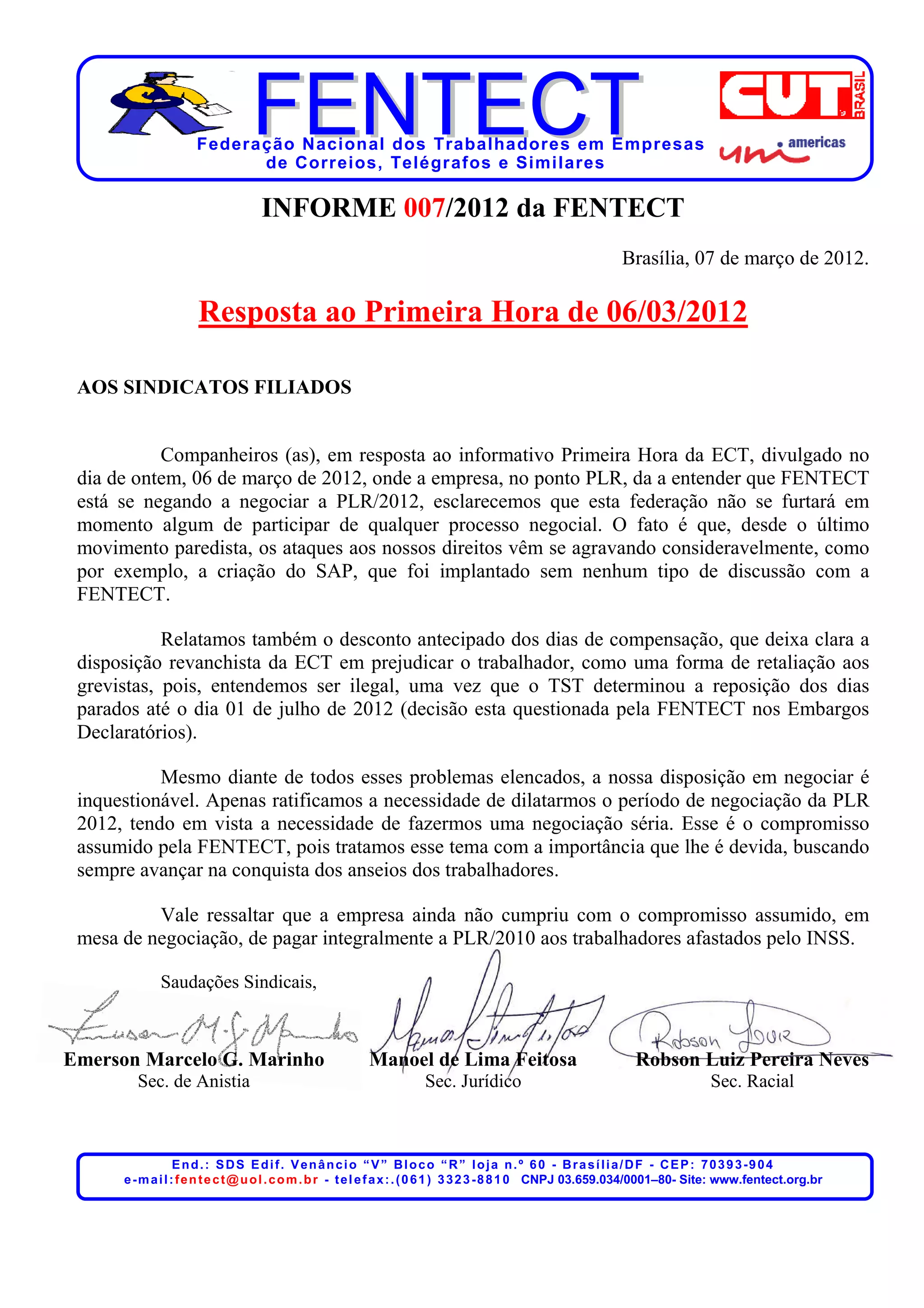 A FENTECT responde à Primeira Hora da ECT sobre negociações da PLR 2012. A federação não se recusa a negociar, mas quer discutir sériamente os ataques aos direitos dos trabalhadores, como o SAP implantado sem discussão. A empresa também não cumpriu compromisso de pagar a PLR 2010 a afastados pelo INSS. A FENTECT busca sempre avançar na conquista dos anseios dos trabalhadores.