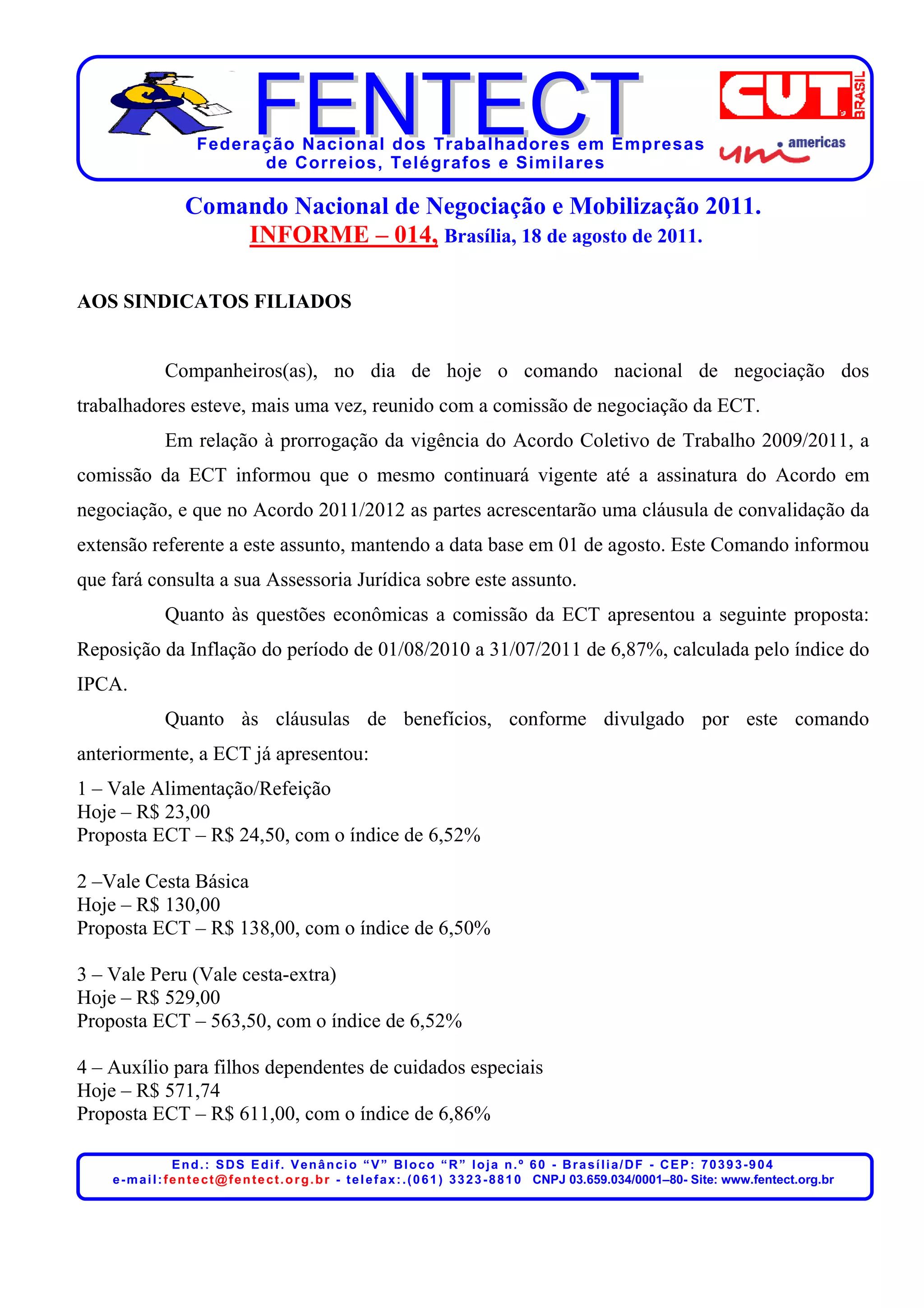 1) A comissão de negociação da ECT propôs reajustar os salários em 6,87% e os benefícios entre 6,52% a 6,86%.
