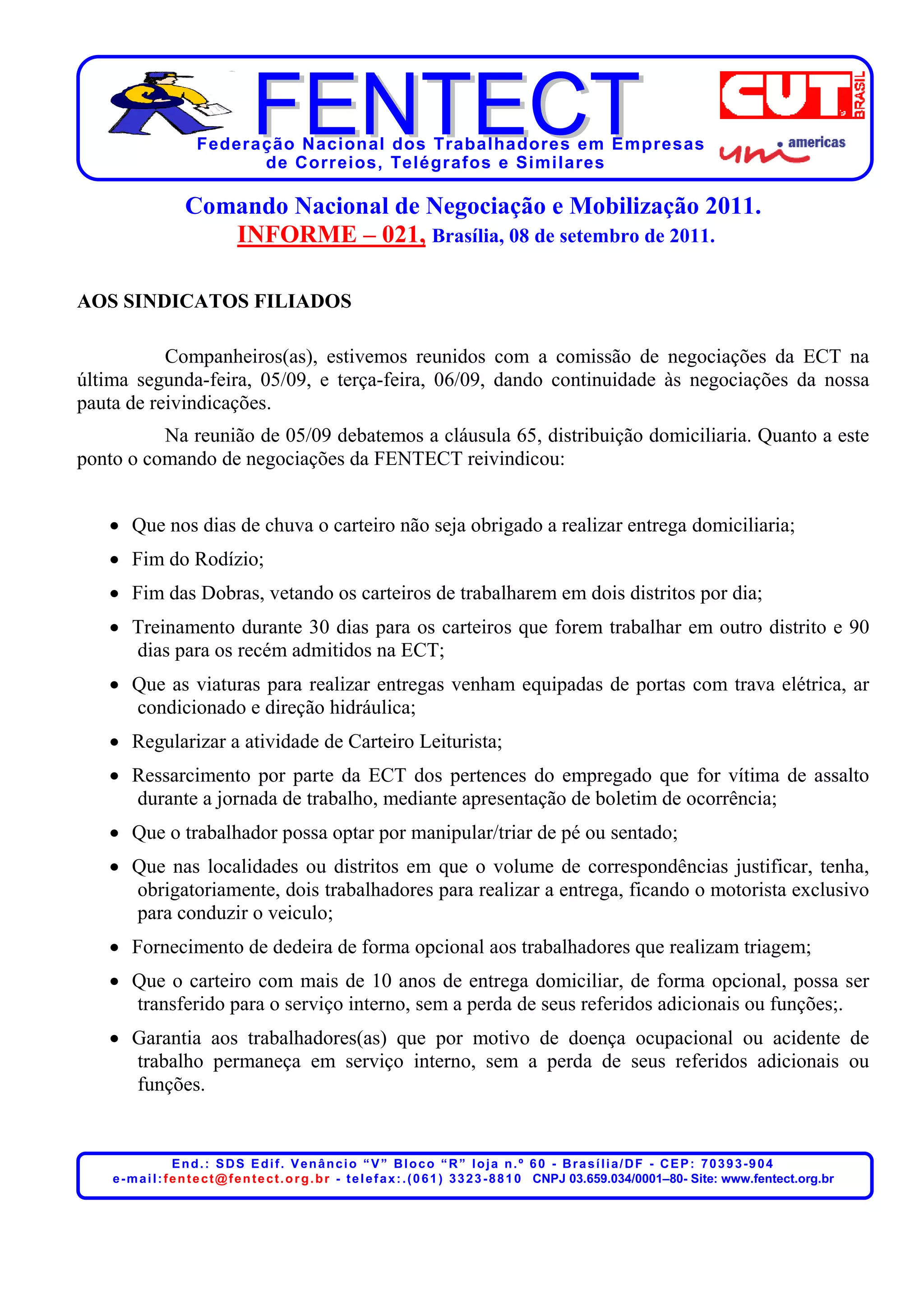 O documento relata as negociações entre a Federação Nacional dos Trabalhadores em Empresas de Correios, Telégrafos e Similares (FENTECT) e a Empresa Brasileira de Correios e Telégrafos (ECT) sobre a pauta de reivindicações dos trabalhadores. A ECT não apresentou propostas para os pontos debatidos. Caso não haja resposta até 09/09, a FENTECT convocará greve nacional a partir de 13/09.
