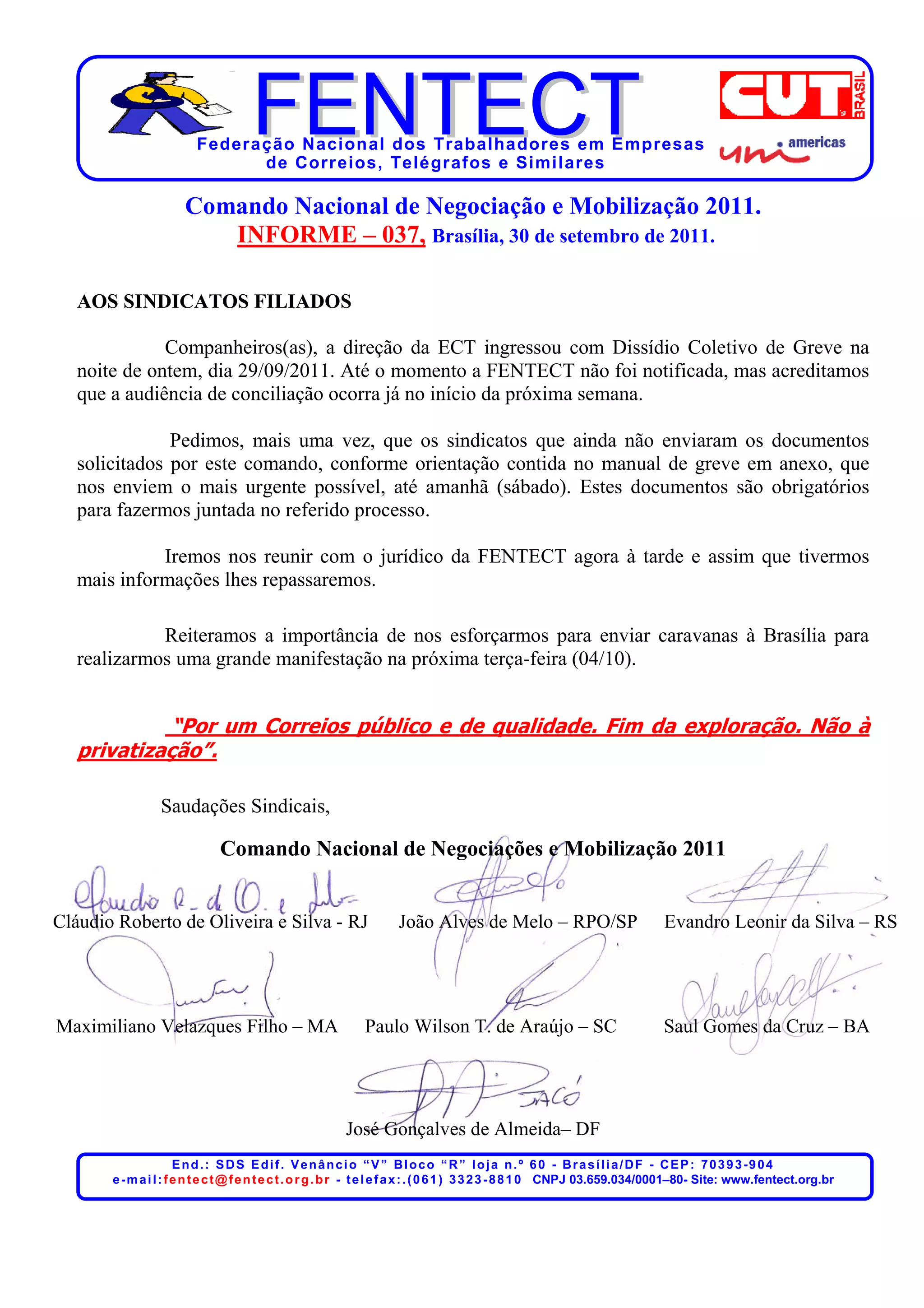 A direção da ECT entrou com um processo de greve. A FENTECT ainda não foi notificada, mas a audiência deve ocorrer na próxima semana. Os sindicatos devem enviar documentos solicitados até sábado para juntar no processo. Uma reunião será realizada para discutir mais informações. É importante enviar caravanas a Brasília para uma manifestação na terça-feira contra a privatização dos Correios.