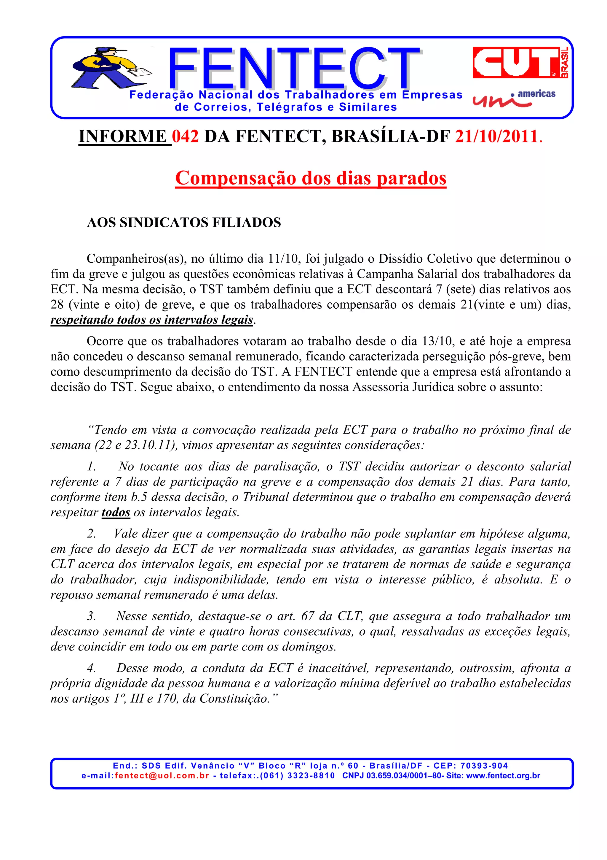 A Federação Nacional dos Trabalhadores em Empresas de Correios, Telégrafos e Similares (FENTECT) informa que o Tribunal Superior do Trabalho (TST) determinou que os trabalhadores da Empresa Brasileira de Correios e Telégrafos (ECT) compensem 21 dias de greve, respeitando os intervalos legais. No entanto, a ECT não concedeu o descanso semanal remunerado aos trabalhadores, desrespeitando a decisão do TST. A FENTECT orienta os trabalhadores a exercerem seu direito ao