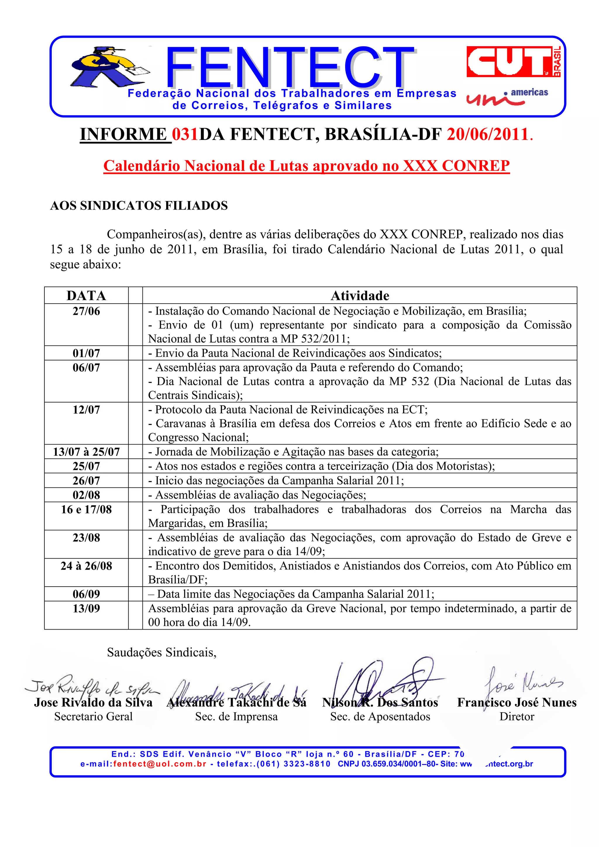 O sindicato dos trabalhadores dos correios aprovou um calendário de lutas contra uma medida provisória que inclui protestos em junho e setembro, com possibilidade de greve geral a partir de 14 de setembro, se as negociações salariais não forem satisfatórias.