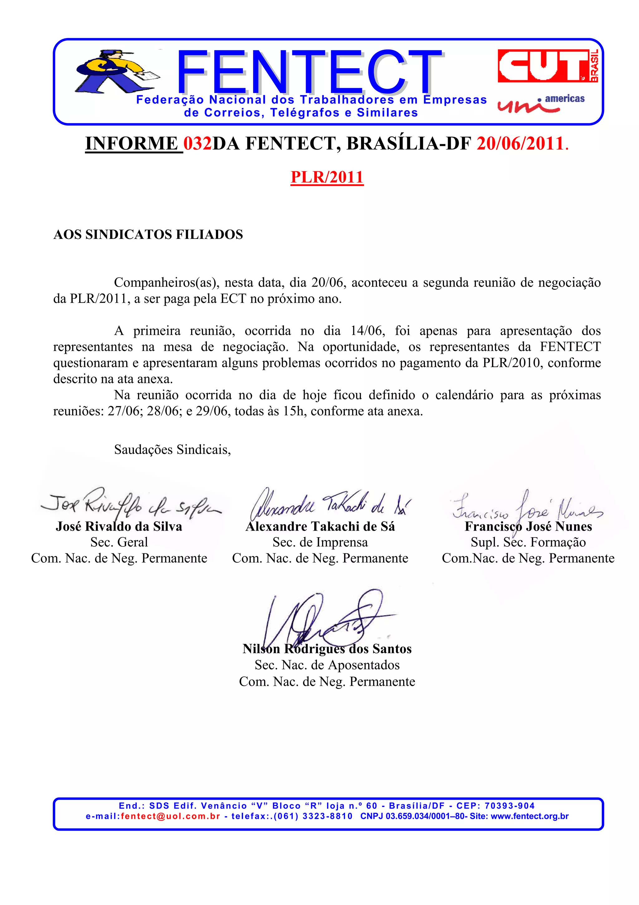 A FENTECT informa seus sindicatos filiados sobre as negociações da Participação nos Lucros e Resultados (PLR) de 2011 da Empresa Brasileira de Correios e Telégrafos (ECT). Na segunda reunião, ficou definido o calendário para as próximas reuniões nos dias 27, 28 e 29 de junho de 2011. Na primeira reunião, a FENTECT questionou problemas ocorridos no pagamento da PLR de 2010.
