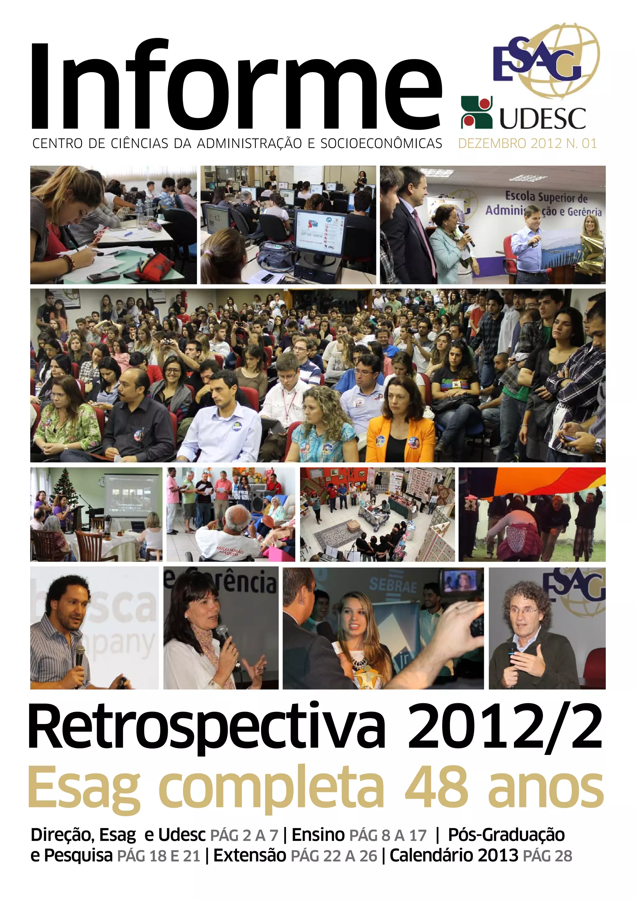 Este informativo destaca as principais atividades realizadas pela Escola Superior de Administração e Gerência (Esag) da Universidade do Estado de Santa Catarina (Udesc) no segundo semestre de 2012, incluindo: a conclusão de 48 anos da Esag; as formaturas do período; as atividades de pós-graduação, extensão e pesquisa; e as perspectivas para 2013.