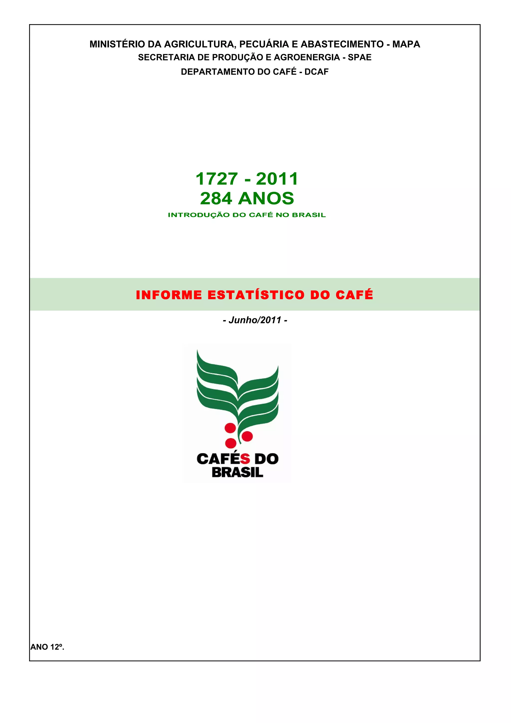 O documento apresenta estatísticas e indicadores da cafeicultura brasileira de 2000 a 2011, incluindo produção, exportações, consumo interno, preços recebidos pelos produtores, orçamento do FUNCAFÉ e participação das exportações brasileiras no mercado mundial. Ele também fornece tabelas e gráficos sobre esses indicadores e sobre liberações de recursos do FUNCAFÉ aos agentes financeiros em 2011.