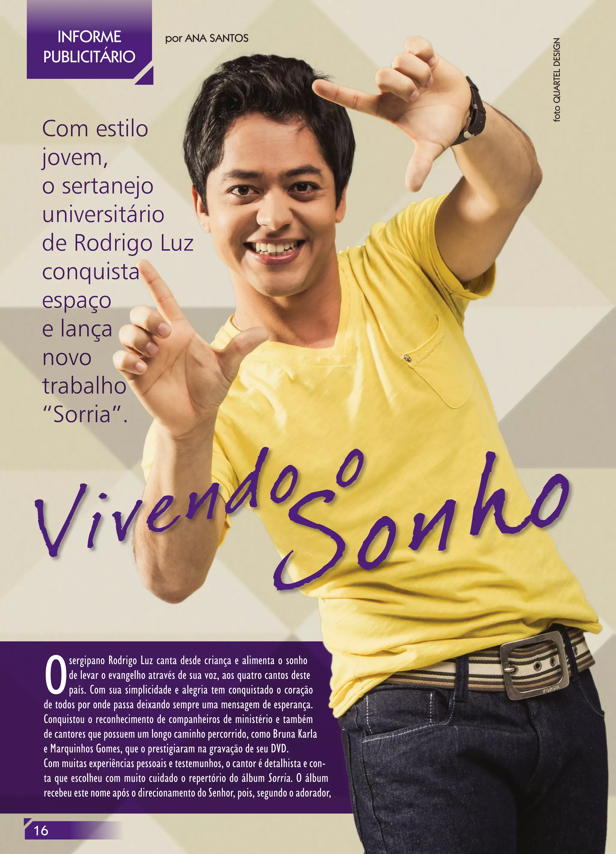 O cantor evangélico Rodrigo Luz lançou seu novo álbum "Sorria" com o objetivo de levar a mensagem de salvação e alegria encontrada em Deus. O álbum contém seis composições próprias de Rodrigo e músicas de outros compositores. Rodrigo tem 29 anos e canta desde a infância, tendo superado uma família problemática e levando hoje o evangelho por meio de sua música.