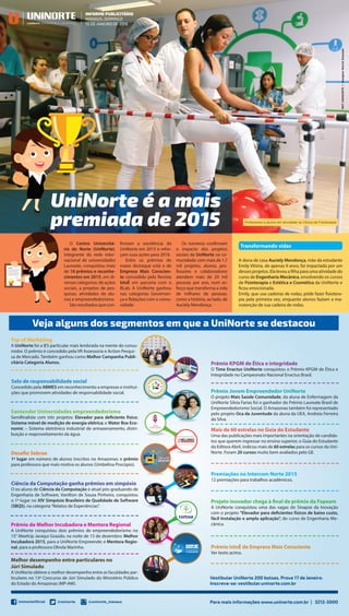 2) A universidade conquistou diversos prêmios em 2015 por projetos de pesquisa, atividades de alunos e ações sociais que beneficiaram mais de 20 mil pessoas.