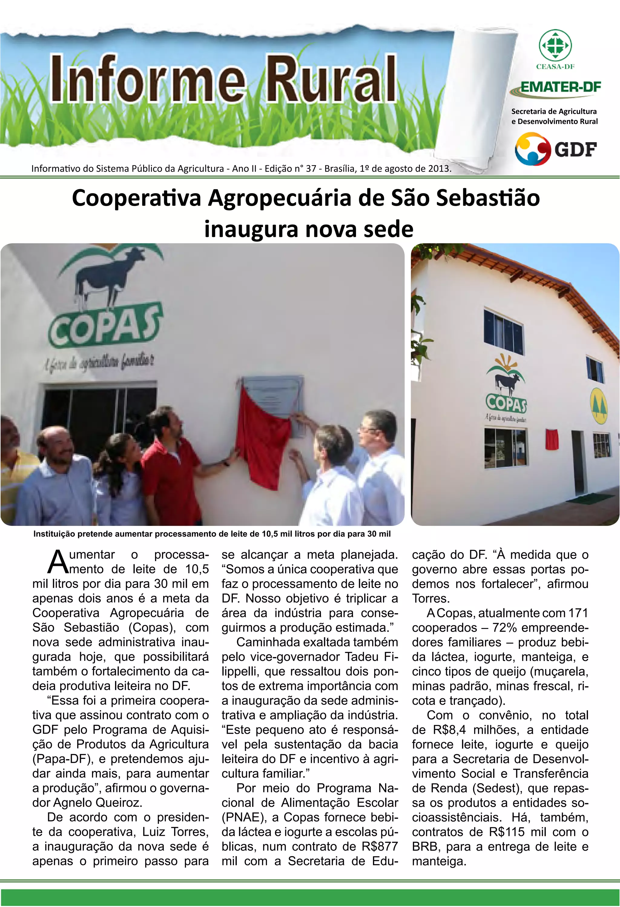 A Cooperativa Agropecuária de São Sebastião (Copas) inaugurou uma nova sede administrativa para aumentar o processamento de leite de 10,5 mil litros por dia para 30 mil litros e fortalecer a cadeia produtiva leiteira no Distrito Federal. A Emater-DF inaugurou um escritório em Cristalina-GO para atender mais de 460 famílias de quatro assentamentos rurais. A Ceasa-DF lançou uma campanha para promover a higienização de caixas plásticas e eliminar a contaminação cruz