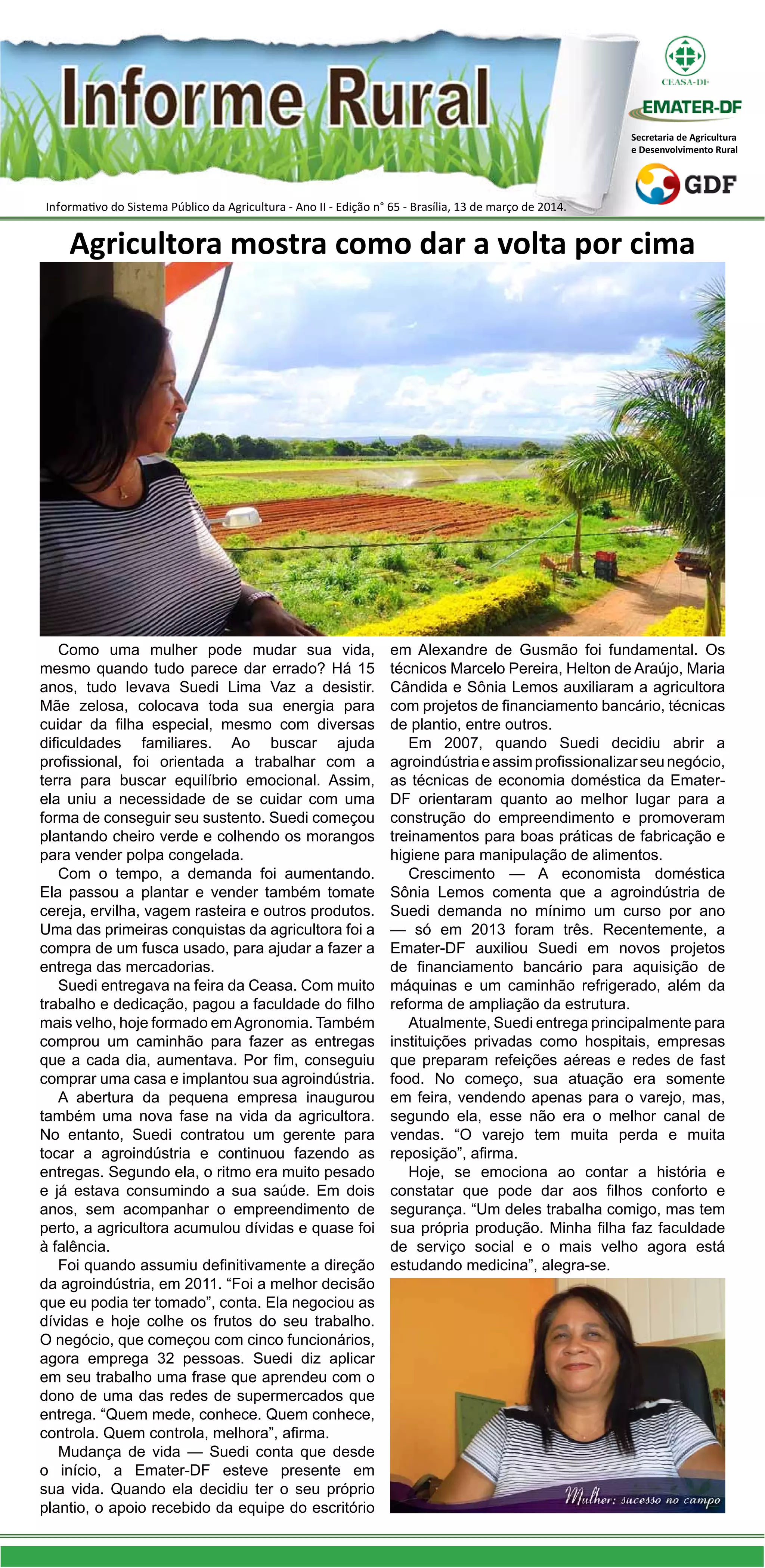 Suedi Lima Vaz conseguiu mudar sua vida através da agricultura familiar, mesmo enfrentando diversas dificuldades. Ela começou plantando cheiro verde e morangos para venda e, com muito trabalho, construiu uma agroindústria que hoje emprega 32 pessoas. A Emater-DF apoiou Suedi com projetos, treinamentos e financiamentos, o que foi fundamental para o sucesso de seu empreendimento.