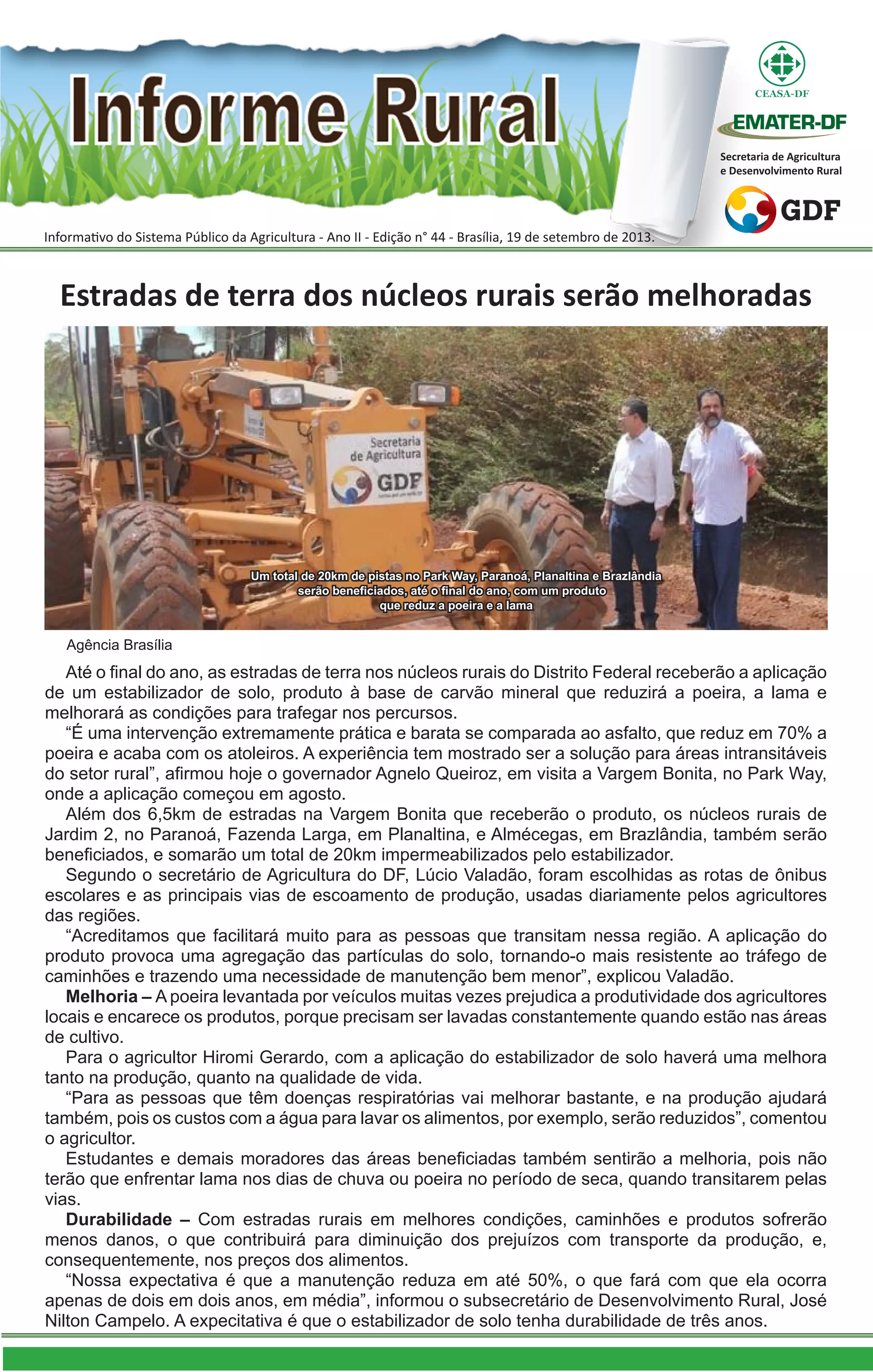 O documento discute melhorias nas estradas rurais do Distrito Federal. Um produto à base de carvão mineral será aplicado em 20km de estradas para reduzir a poeira e a lama, melhorando as condições de tráfego para agricultores e estudantes. O governador e secretário de Agricultura esperam que isso facilite o transporte e reduza custos para os produtores rurais.