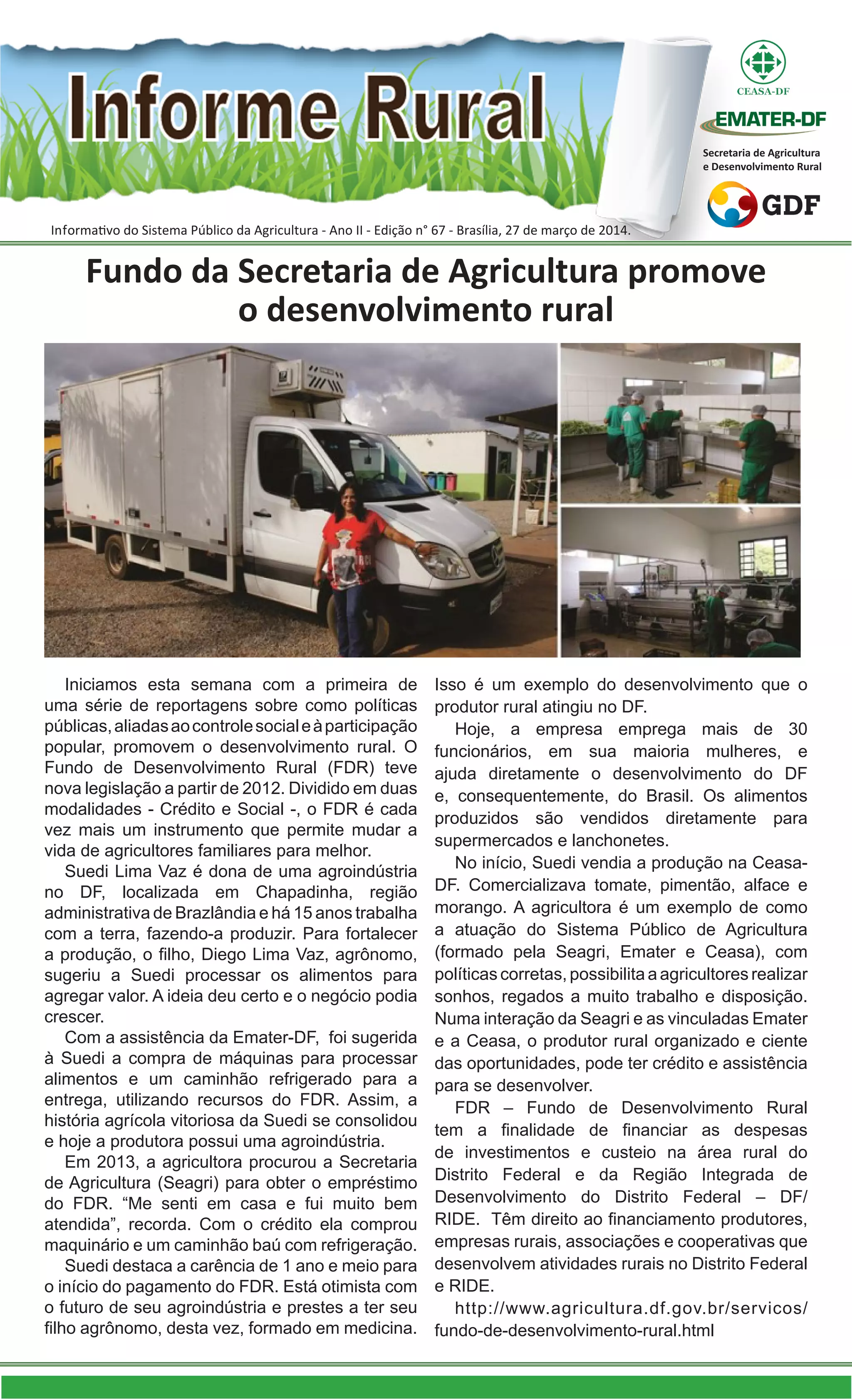 O documento descreve como o Fundo de Desenvolvimento Rural (FDR) financiou a expansão da agroindústria de Suedi Lima Vaz no Distrito Federal, permitindo que ela comprasse máquinas e um caminhão para processar e entregar seus produtos, gerando mais empregos na região. O FDR tem o objetivo de financiar projetos de investimento e custeio na área rural do DF.