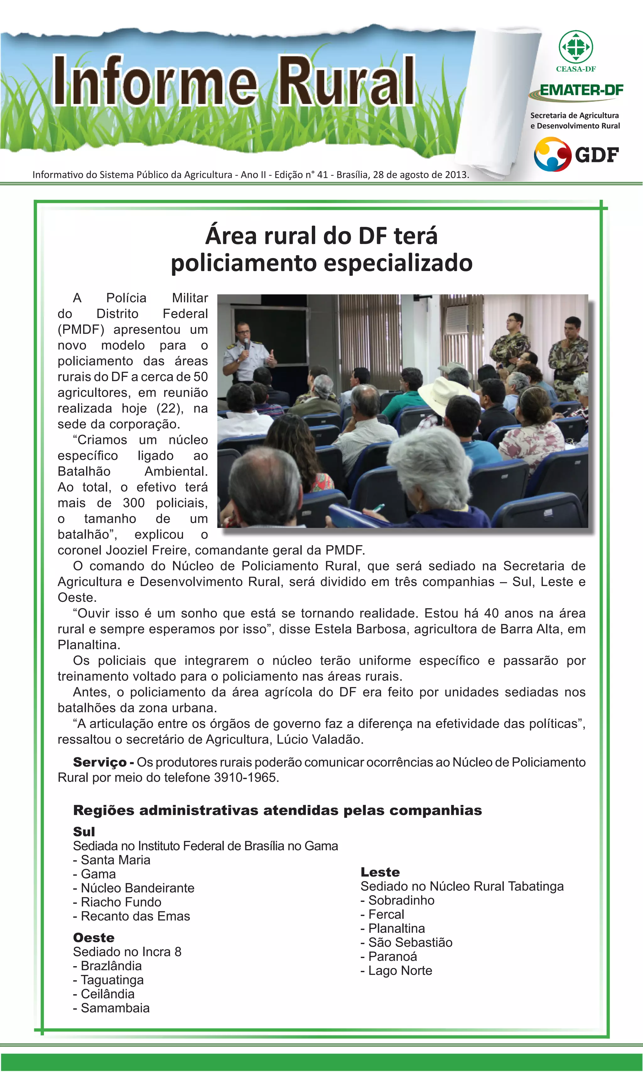 O documento descreve (1) a criação de um núcleo especializado da Polícia Militar do DF para o policiamento das áreas rurais, dividido em três companhias; (2) a aplicação de um estabilizador de solo em estradas rurais de terra para melhorar a durabilidade durante o período de seca e chuvas; (3) uma parceria entre a Secretaria de Agricultura e o Detran para levar cursos de formação de condutores para áreas rurais, beneficiando moradores que antes precisavam se deslocar à c