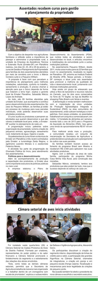 O documento descreve (1) a instalação da Câmara Setorial da Cadeia Produtiva de Suínos no Distrito Federal para fortalecer o setor da suinocultura; (2) um curso oferecido pela Emater-DF sobre gestão e planejamento da propriedade rural para assentados; e (3) o início do Campeonato Rural de Futebol para promover a prática esportiva na área rural.