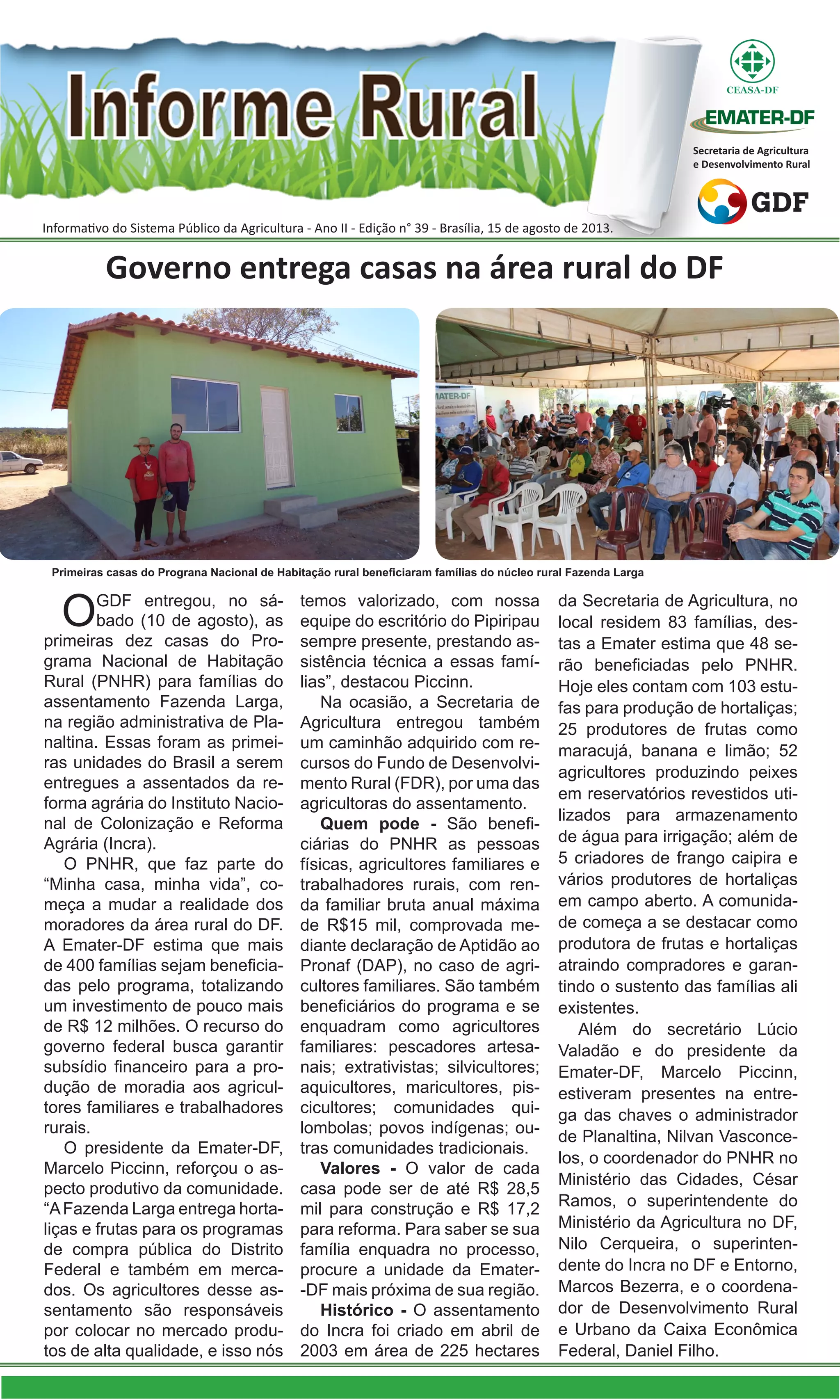 1) O governo do Distrito Federal entregou as primeiras 10 casas do Programa Nacional de Habitação Rural para famílias do assentamento Fazenda Larga.