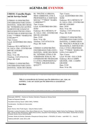 O documento discute as privatizações no sistema público de saúde brasileiro e seus impactos negativos. A privatização tem levado ao sucateamento de hospitais públicos e à perda de autonomia das universidades sobre os hospitais universitários. A agenda de eventos no final lista cursos sobre esses temas promovidos pelo Conselho Regional de Serviço Social.