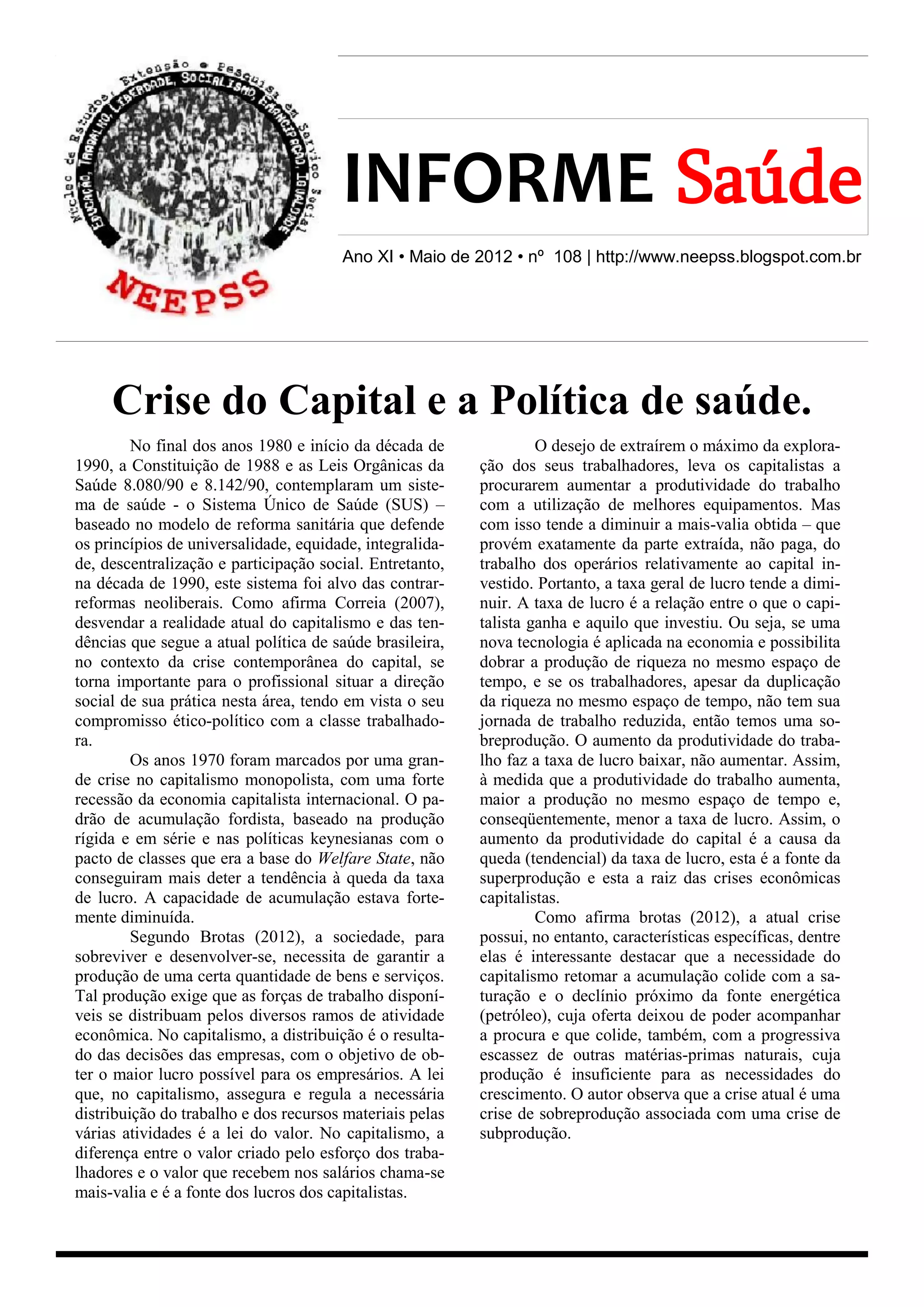 O documento discute como a crise do capitalismo afeta as políticas de saúde no Brasil. A taxa de lucro tende a cair devido ao aumento da produtividade, levando a crises de sobreprodução. Os organismos internacionais pressionam por privatizações e flexibilização dos direitos trabalhistas. Isso fragiliza o SUS e precariza o trabalho na saúde. É necessário defender os princípios da reforma sanitária e articular forças políticas em torno de um projeto alternativo à lógica do capital.