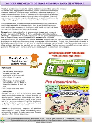 O documento discute como as ervas medicinais e condimentares têm propriedades antioxidantes superiores à vitamina E, e lista alguns alimentos ricos em antioxidantes como tomates, couves, pimentões e uvas passas que podem ajudar a prevenir o câncer. A receita do mês é uma torta de coco com castanha do Pará.