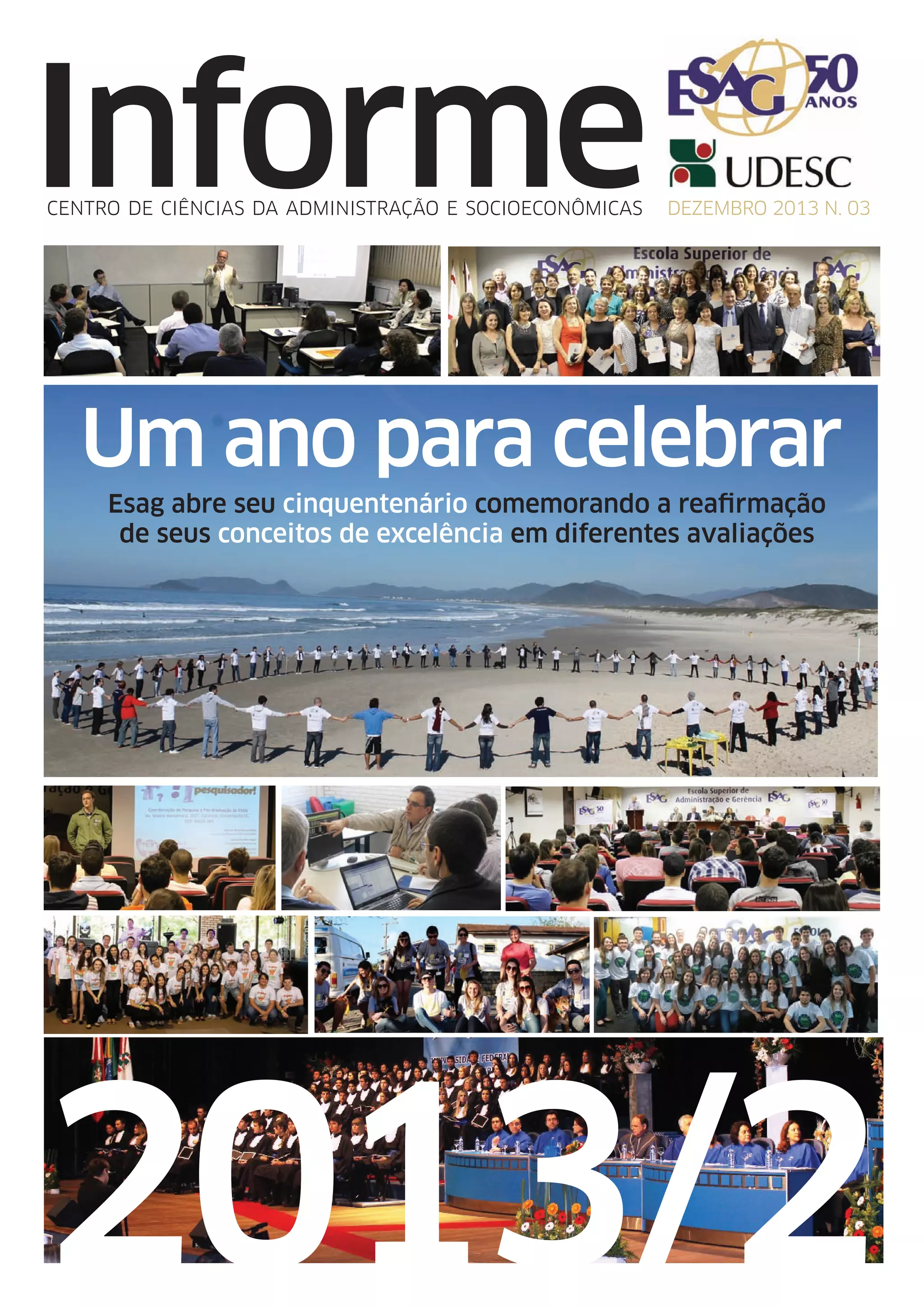 Este documento resume um informativo do Centro de Ciências da Administração e Socioeconômicas (Esag) da Universidade do Estado de Santa Catarina (Udesc) sobre as atividades e realizações do segundo semestre de 2013. O Esag teve um ano de sucesso com excelentes avaliações em Enade e conceitos máximos nos cursos, aprovação de novos projetos de pós-graduação, e eventos comemorativos de seu 50o aniversário.