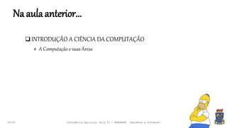 O documento discute hardware e software de computadores. Apresenta os principais componentes de hardware como CPU, ULA, BIOS, memória e periféricos. Também discute software como algoritmos, programas, linguagens de programação e sistemas operacionais.