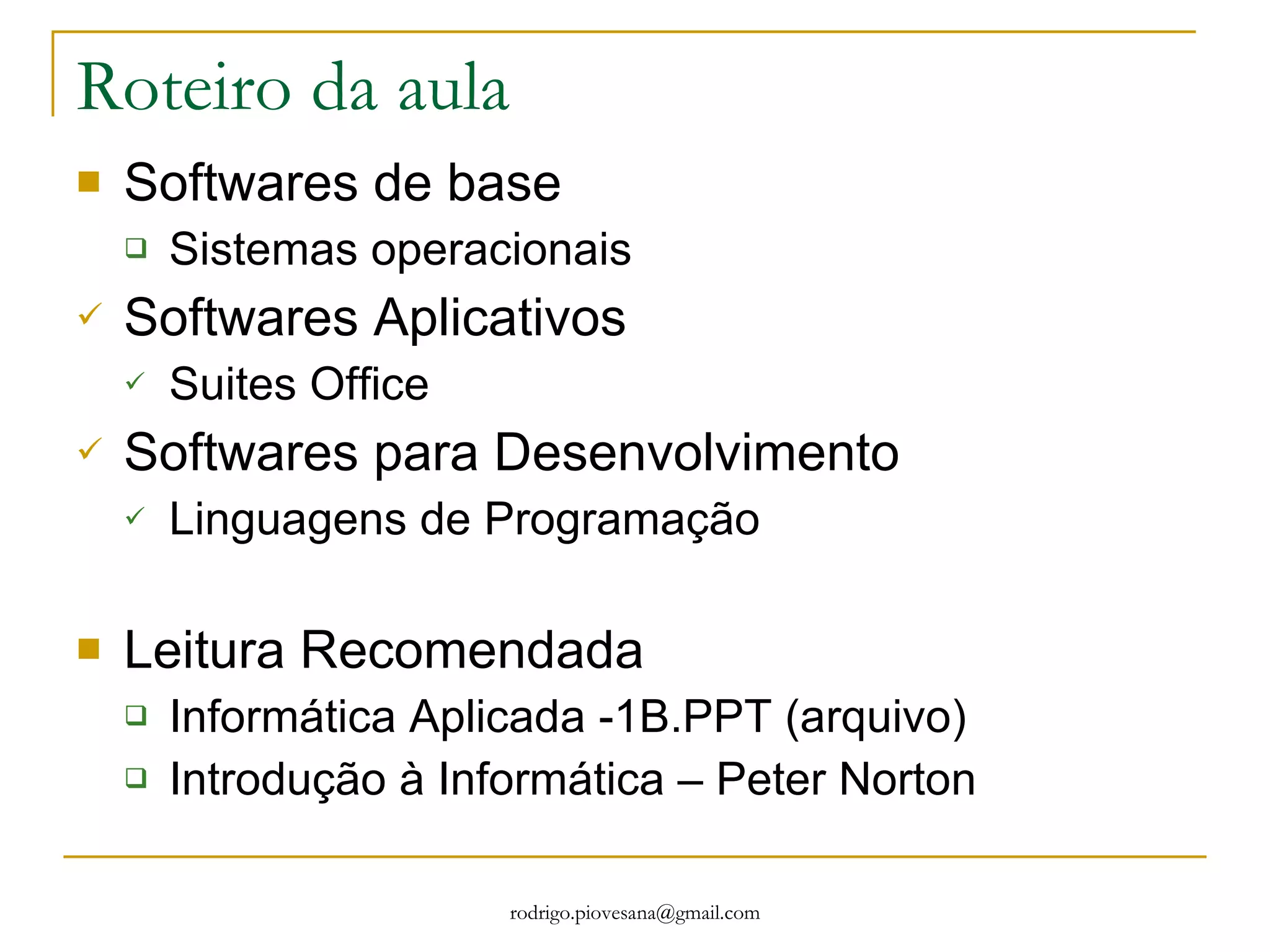 O documento fornece uma lista de softwares de escritório comuns e linguagens de programação, com breves descrições de cada um. Ele discute suites de escritório como Microsoft Office e OpenOffice, além de processadores de texto, planilhas eletrônicas e softwares para desenvolvimento, incluindo C, Pascal, Visual C++ e Java.