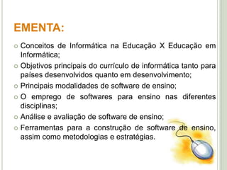 Este documento discute a aplicação da tecnologia na educação. Aborda conceitos como informática na educação versus educação em informática, objetivos do currículo de informática, tipos de softwares educacionais e ferramentas para criação de softwares educativos. Também discute a história da informática educativa no Brasil e as possibilidades e desafios do aprendizado de informática.