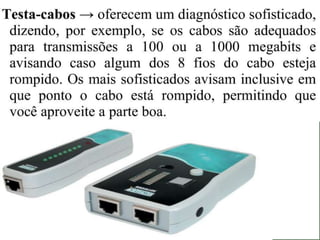 O documento discute conceitos básicos sobre redes de computadores, incluindo componentes como cabos, conectores, hubs, switches e roteadores. Também aborda topologias de rede e diferenças entre redes locais e amplas.