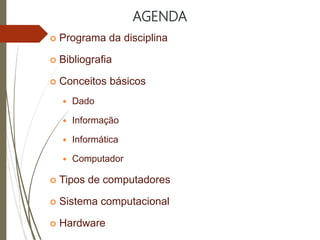 O documento introduz conceitos básicos de informática, definindo dados, informação e computador. Explica que dados se tornam informação quando organizados de forma entendível e que computadores processam dados para auxiliar nas tarefas que envolvem informação. Também resume os principais componentes de hardware de um computador, incluindo CPU, memória e periféricos.