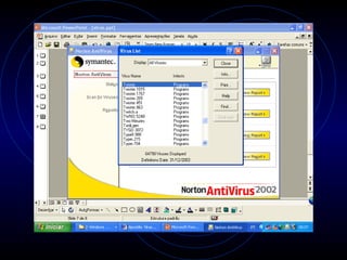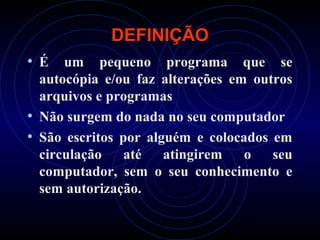 O documento descreve vários tipos de vírus de computador, como se propagam, como infectam arquivos e sistemas, e medidas de precaução para se proteger de infecções.