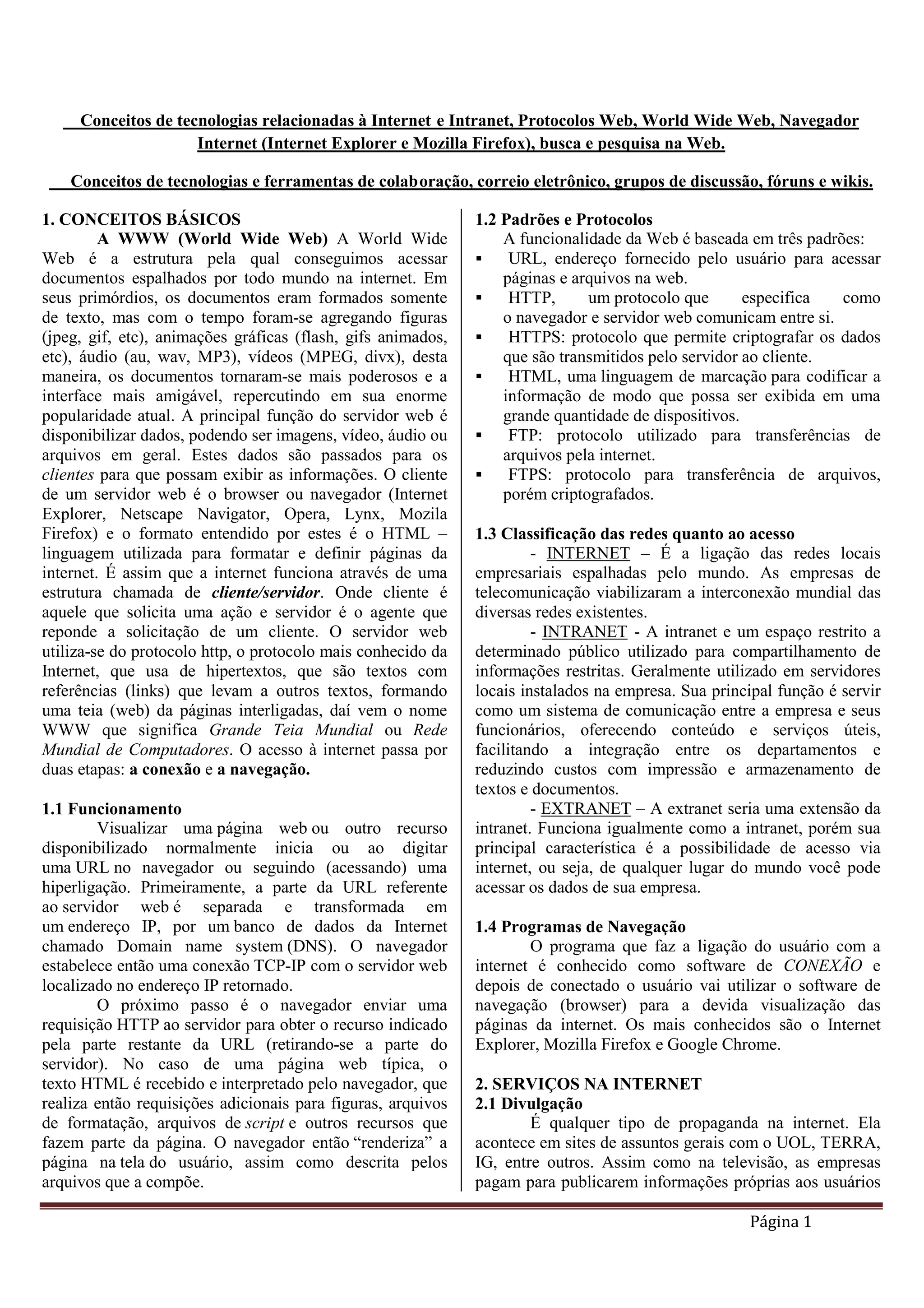 Conceitos detecnologias relacionadas à Internet e Intranet, Protocolos Web, World Wide Web, Navegador