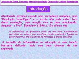 Este documento discute como a informática pode ser usada como ferramenta educacional nas escolas. Ele descreve uma tarefa em que os alunos pesquisam escolas que usam computadores há mais tempo e comparam com sua própria escola. Os alunos são divididos em grupos para pesquisar sites recomendados e construir um slide sobre como a informática pode transformar a educação.