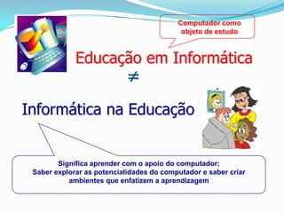 O documento discute a disciplina de Informática na Educação. Ele explica que a Informática na Educação significa aprender com o apoio do computador, explorando suas potencialidades para criar ambientes que enfatizem a aprendizagem. A disciplina usa a tecnologia do computador para melhorar o processo de ensino-aprendizagem do aluno e também discute a formação do professor e uma proposta metodológica.