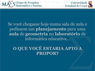 Este documento apresenta uma introdução à Informática Educativa e seu uso no ensino de Geometria. Em 3 frases: (1) Discute concepções de aprendizagem e abordagens de softwares educativos; (2) Explica como as tecnologias digitais podem ser usadas no ensino de Matemática de forma construtivista; (3) Propõe uma atividade prática em duplas sobre um conteúdo geométrico usando recursos digitais.