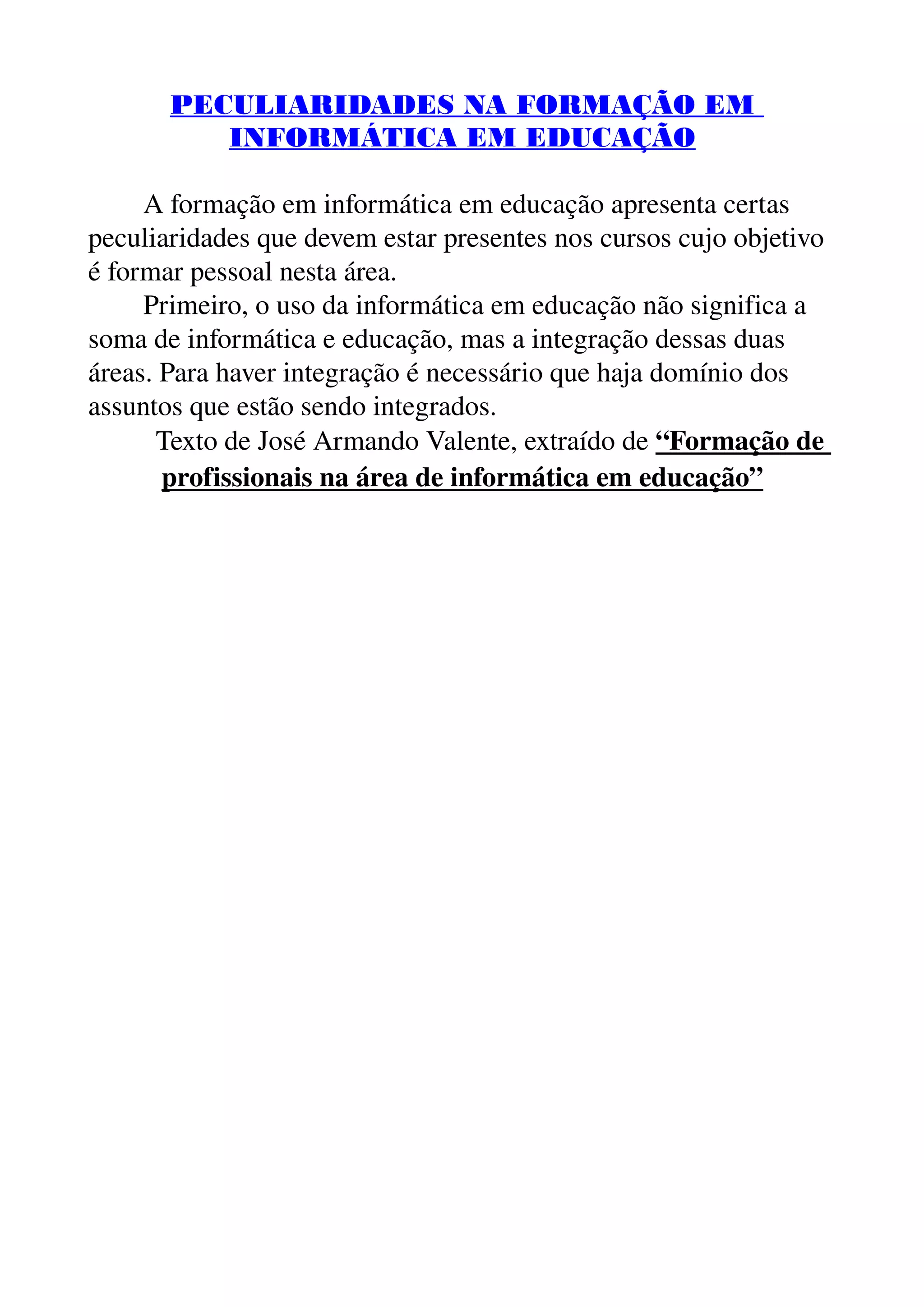 O documento discute as peculiaridades da formação em informática em educação, destacando que (1) a integração de informática e educação requer domínio de ambas as áreas, não apenas sua soma, e (2) os cursos devem preparar os alunos para o uso pedagógico da tecnologia, não apenas seu manuseio técnico.