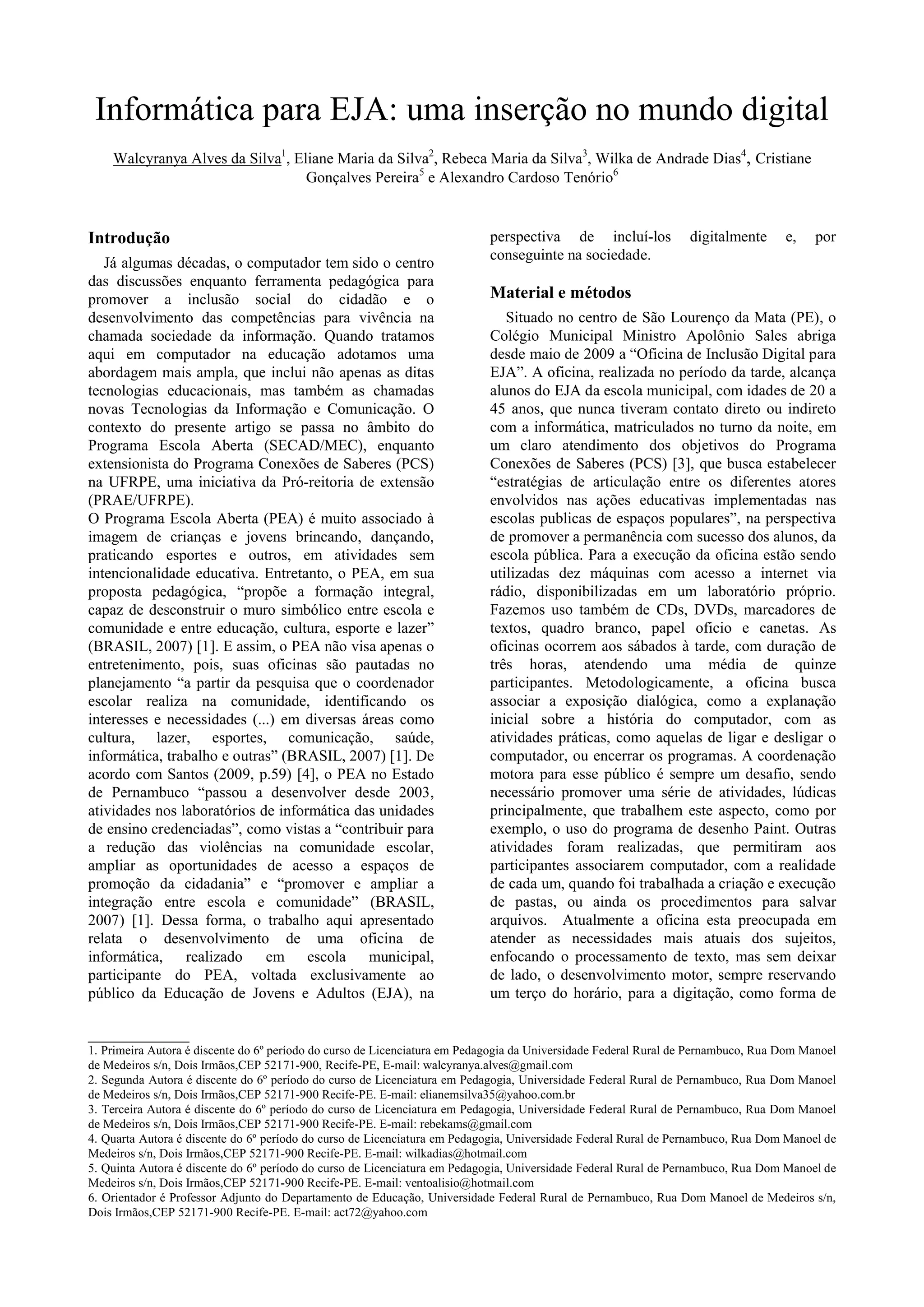 Este documento descreve uma oficina de informática realizada para alunos da Educação de Jovens e Adultos (EJA) com o objetivo de incluí-los digitalmente. A oficina ocorreu em uma escola municipal e utilizou computadores para ensinar os participantes sobre informática básica e processamento de texto. Os resultados indicaram que a oficina aumentou a autoestima e autonomia dos alunos com a tecnologia e também os incentivou a continuar seus estudos.