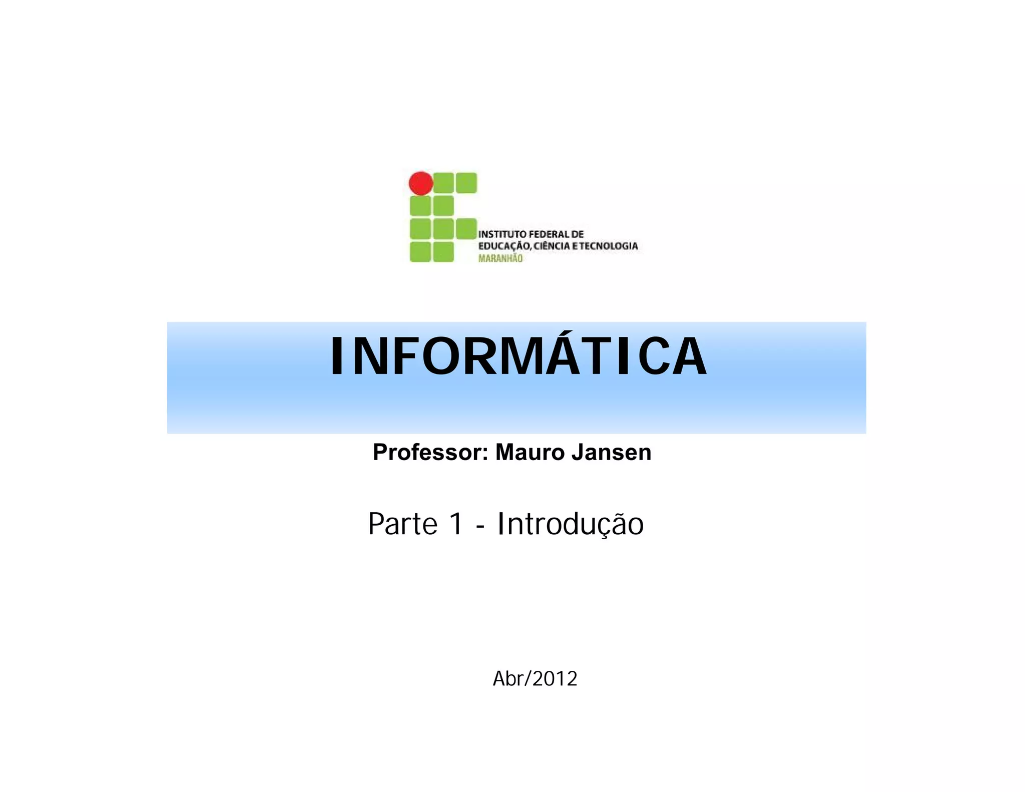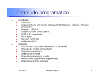 Este documento apresenta um resumo do conteúdo programático de uma disciplina de Informática Básica. Ele discute conceitos como hardware, software, bits, bytes e sistemas numéricos, além de fornecer uma breve história do desenvolvimento dos computadores.