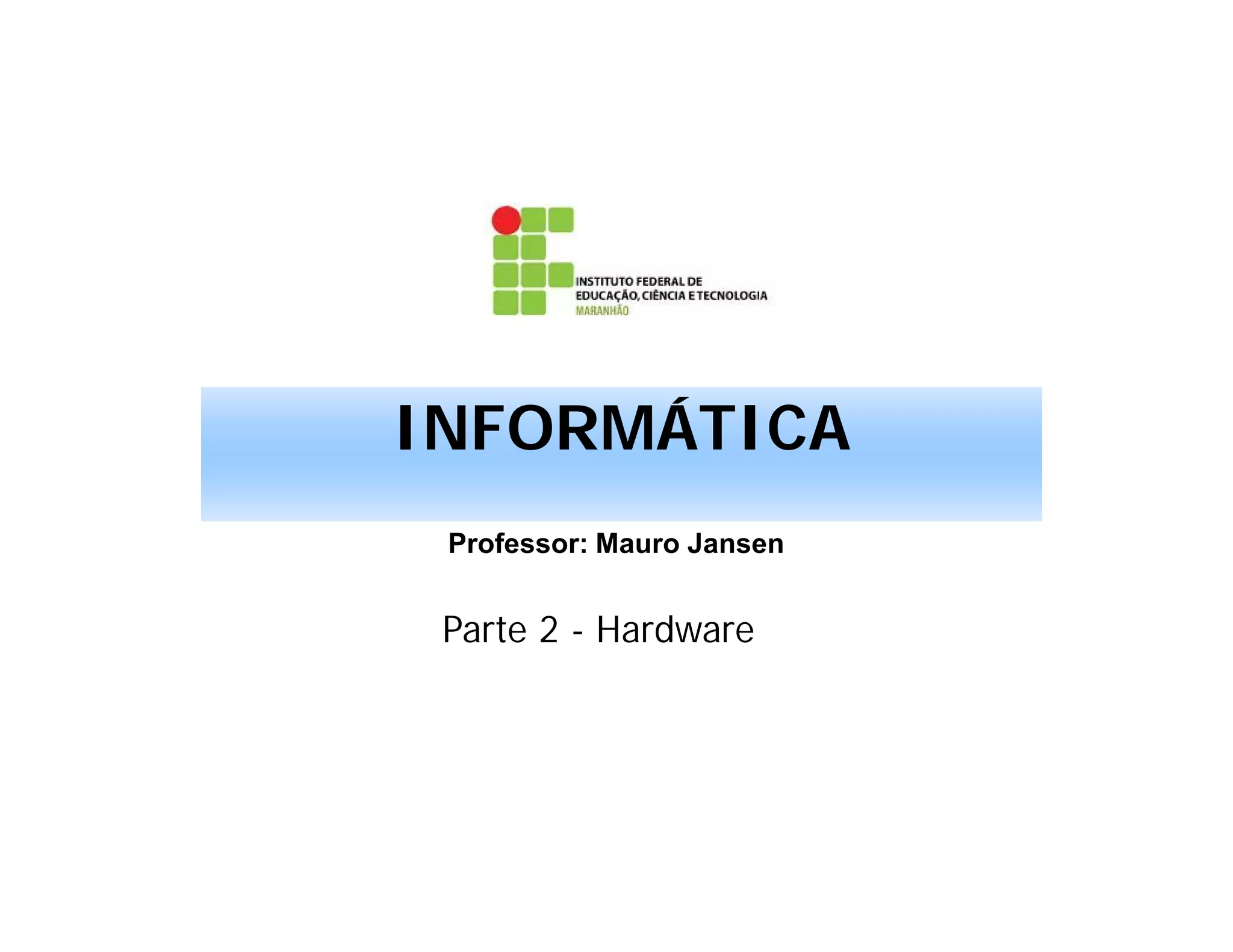 O documento aborda os fundamentos do hardware, incluindo a arquitetura do computador, unidades de entrada e saída, e diferentes tipos de memória. São discutidos componentes essenciais como a CPU, memória RAM e ROM, além de dispositivos periféricos como teclado, mouse e impressoras. O texto também menciona as capacidades de armazenamento, velocidade de processamento e unidades de medida relacionadas ao hardware.
