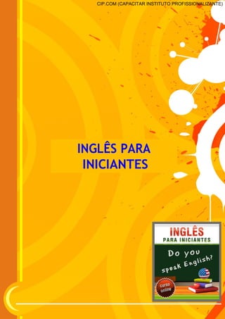 Este documento apresenta uma introdução à língua inglesa para iniciantes. Ele discute o alfabeto inglês, saudações comuns, conversação básica, diferenças entre inglês americano e britânico, e conceitos gramaticais como pronomes, verbos e artigos. O documento também fornece vocabulário comum sobre cores, números, dias da semana, meses, horas, datas, comidas e profissões.