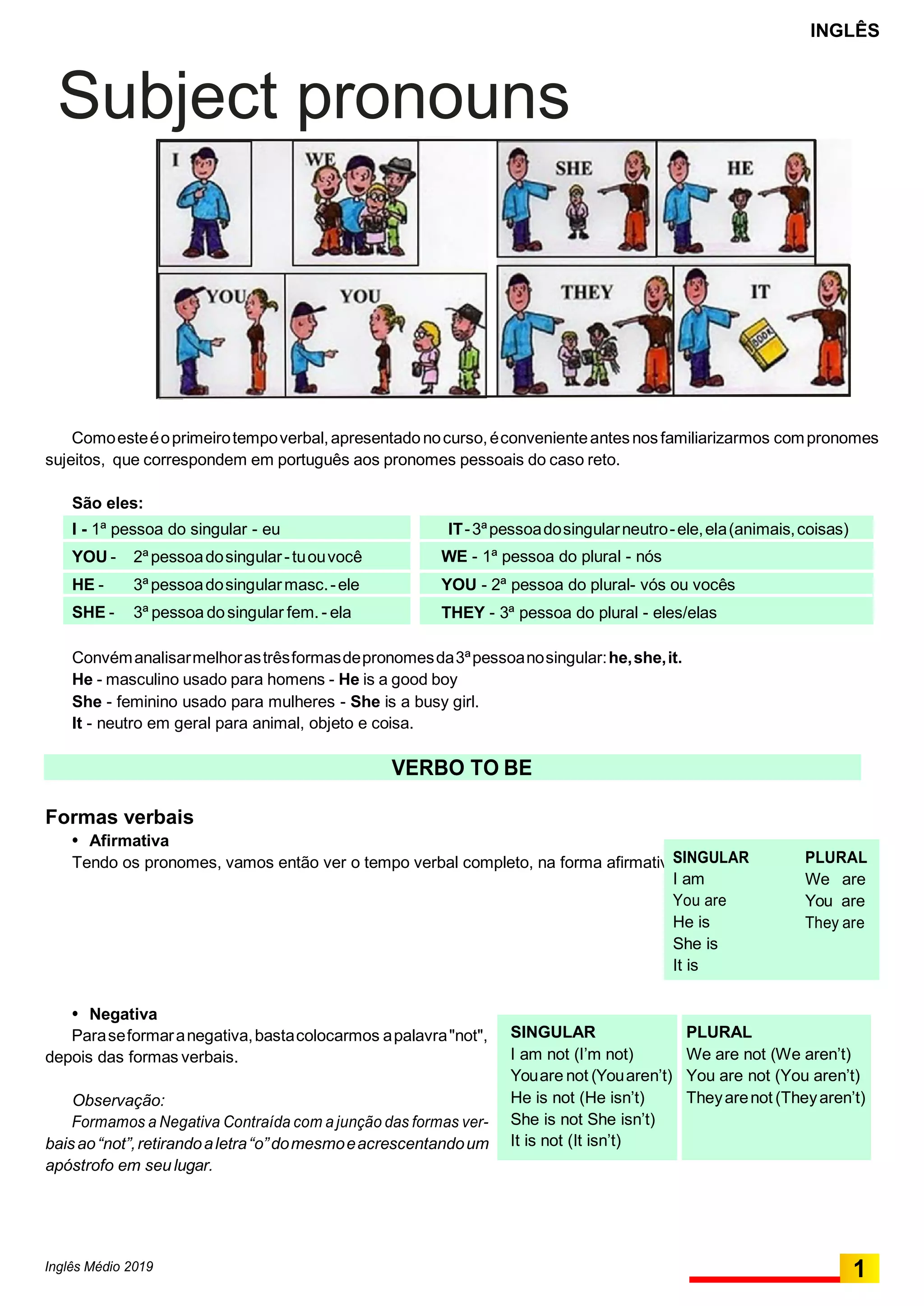 1) O documento apresenta pronomes pessoais em inglês e suas formas verbais no presente simples.