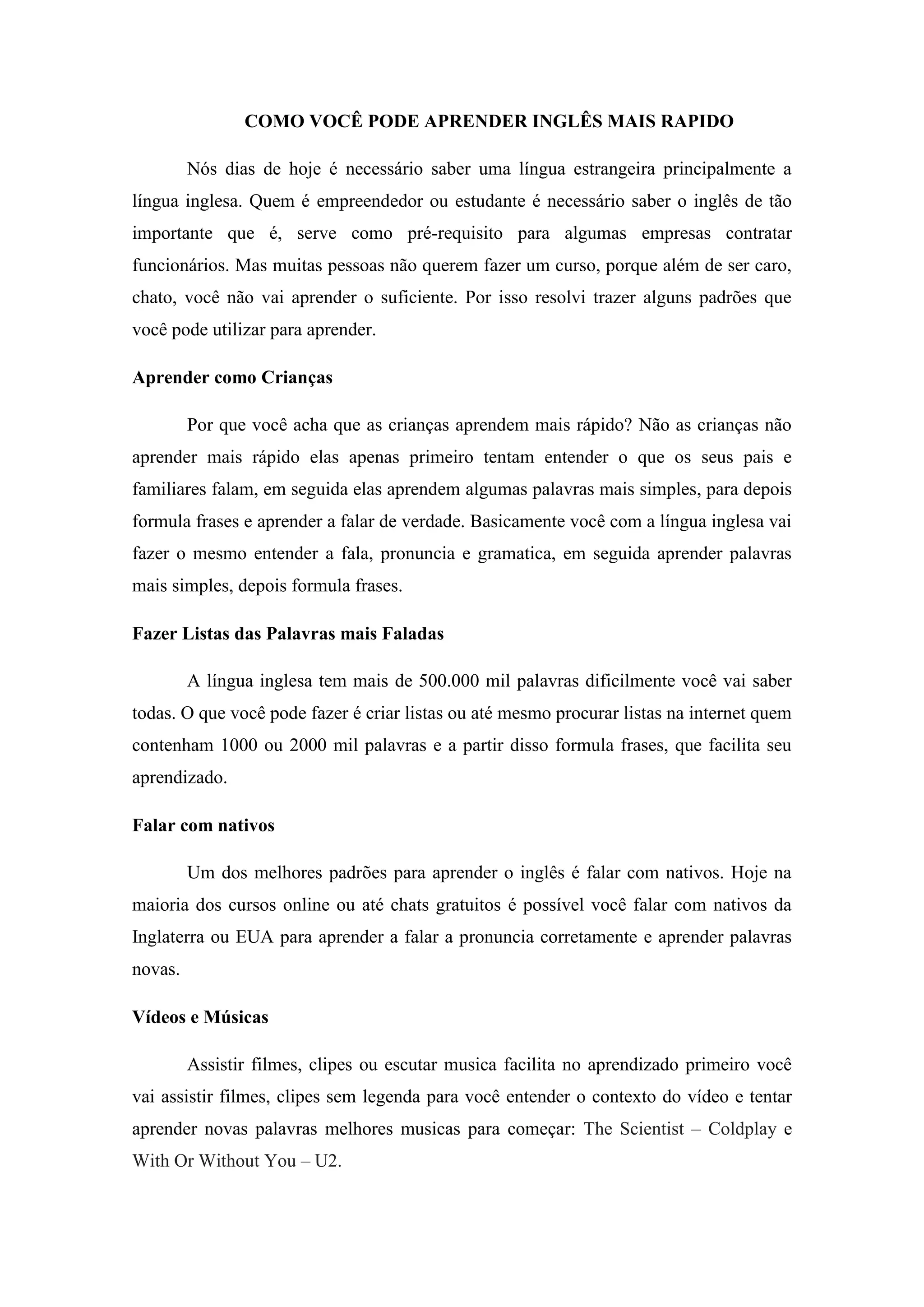 Este documento fornece dicas para aprender inglês mais rapidamente, incluindo aprender como crianças, fazer listas de palavras comuns, falar com nativos, assistir vídeos e música sem legendas, e se imergir na língua.