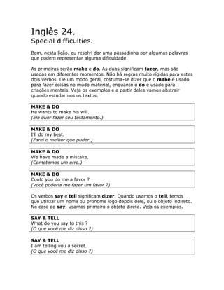 Este documento discute palavras em inglês que podem apresentar dificuldades, incluindo os verbos "make" e "do", "say" e "tell", falsos cognatos e conjunções. Exemplos são fornecidos para ilustrar as diferenças entre esses pares de palavras e como elas são usadas corretamente.
