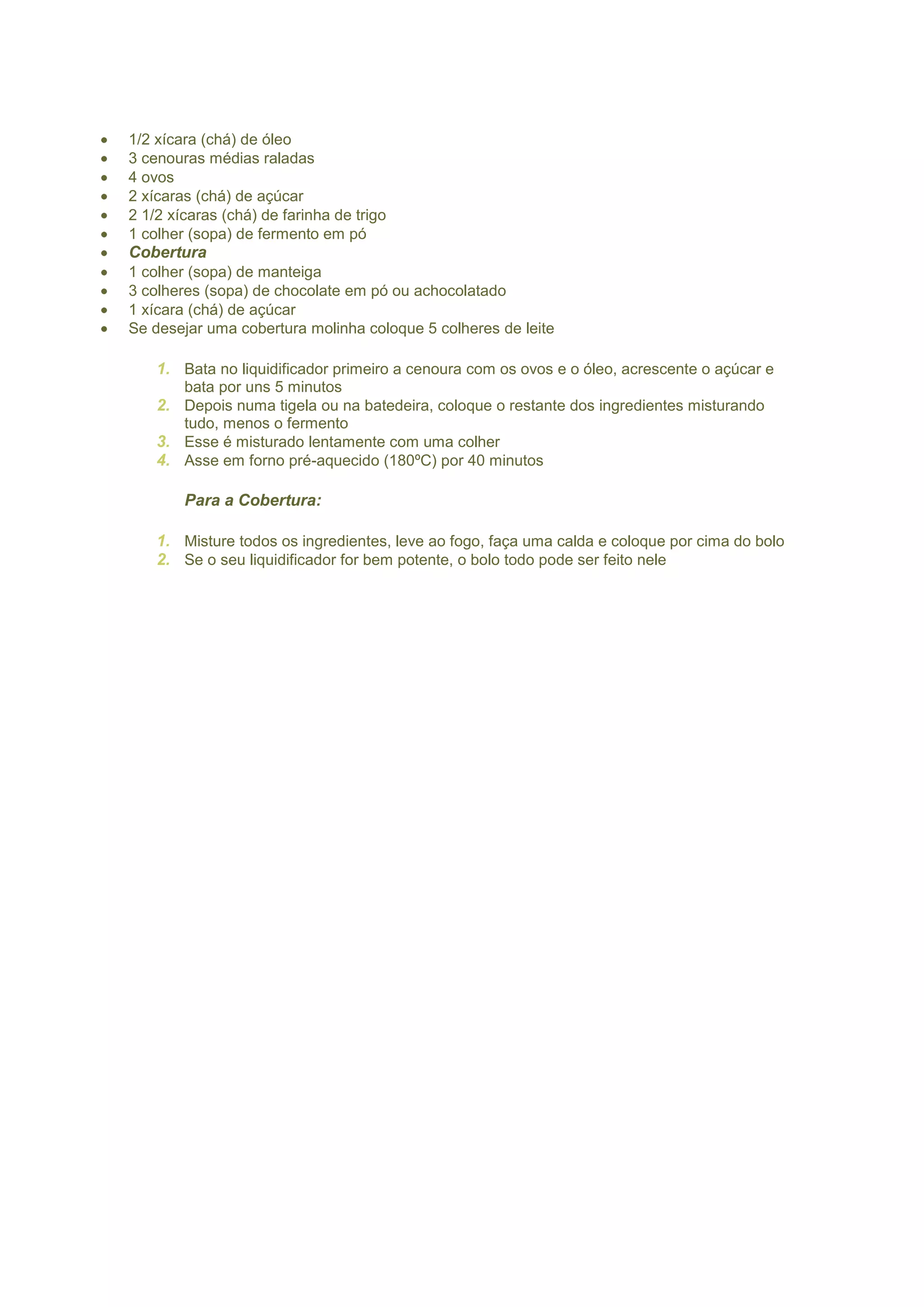Este documento fornece uma receita para bolo de cenoura com cobertura de chocolate. A receita inclui ingredientes como óleo, cenoura, ovos e açúcar para o bolo, e manteiga, chocolate em pó e açúcar para a cobertura. O bolo é preparado batendo os ingredientes no liquidificador e assando por 40 minutos, enquanto a cobertura é feita misturando os ingredientes e cobrindo o bolo após o cozimento.