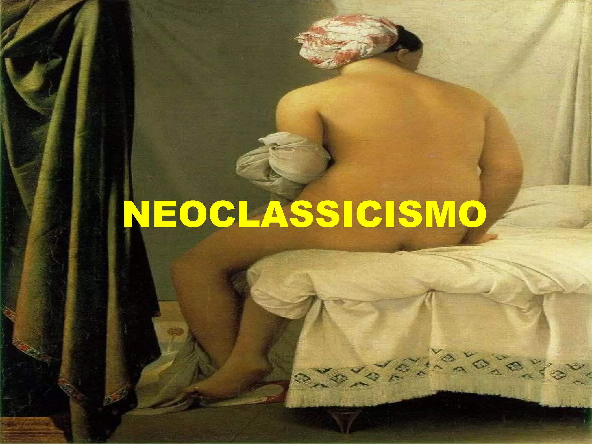 O documento descreve o estilo artístico Neoclassicismo, caracterizado pelo retorno aos modelos da Grécia e Roma antigas. Também aborda o estilo Rococó e apresenta a vida e obra do pintor neoclássico Jean-Auguste Dominique Ingres, notável por retratos e cenas mitológicas inspiradas na Antiguidade Clássica.