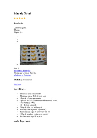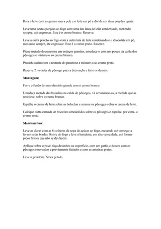 Este documento fornece a receita de um pavê de Natal com várias camadas e dois cremes, um branco e um preto, feitos com leite condensado, leite em pó e ovos. O pavê é montado em um refratário alternando camadas do creme branco e biscoitos umedecidos na calda de pêssegos com fatias dos mesmos, finalizando com o creme preto por cima e coberto por marshmallow decorado com pêssegos e ameixas.