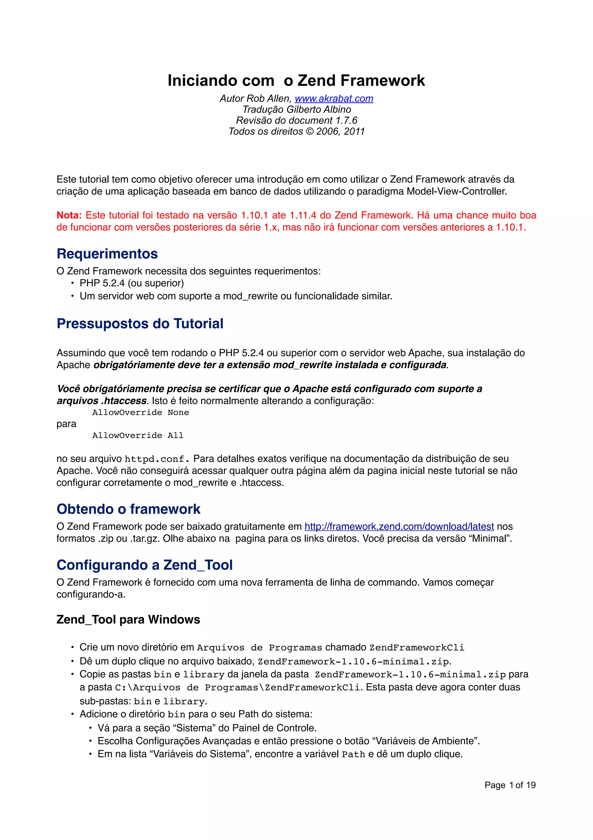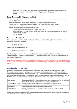 Este documento fornece uma introdução ao uso do framework Zend através da criação de uma aplicação de gerenciamento de álbuns de música usando o padrão MVC. Ele explica como configurar o ambiente, criar o esqueleto do projeto, definir o controlador e suas ações e iniciar o desenvolvimento da aplicação.