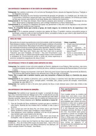 1) O documento discute o que significa ser católico, incluindo crer na Santíssima Trindade, alimentar a fé através da Revelação Divina, e viver a fé como um dom gratuito de Deus.