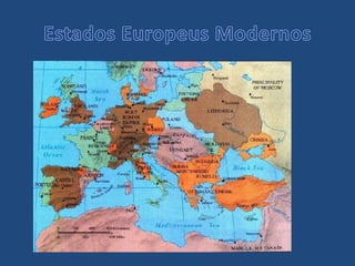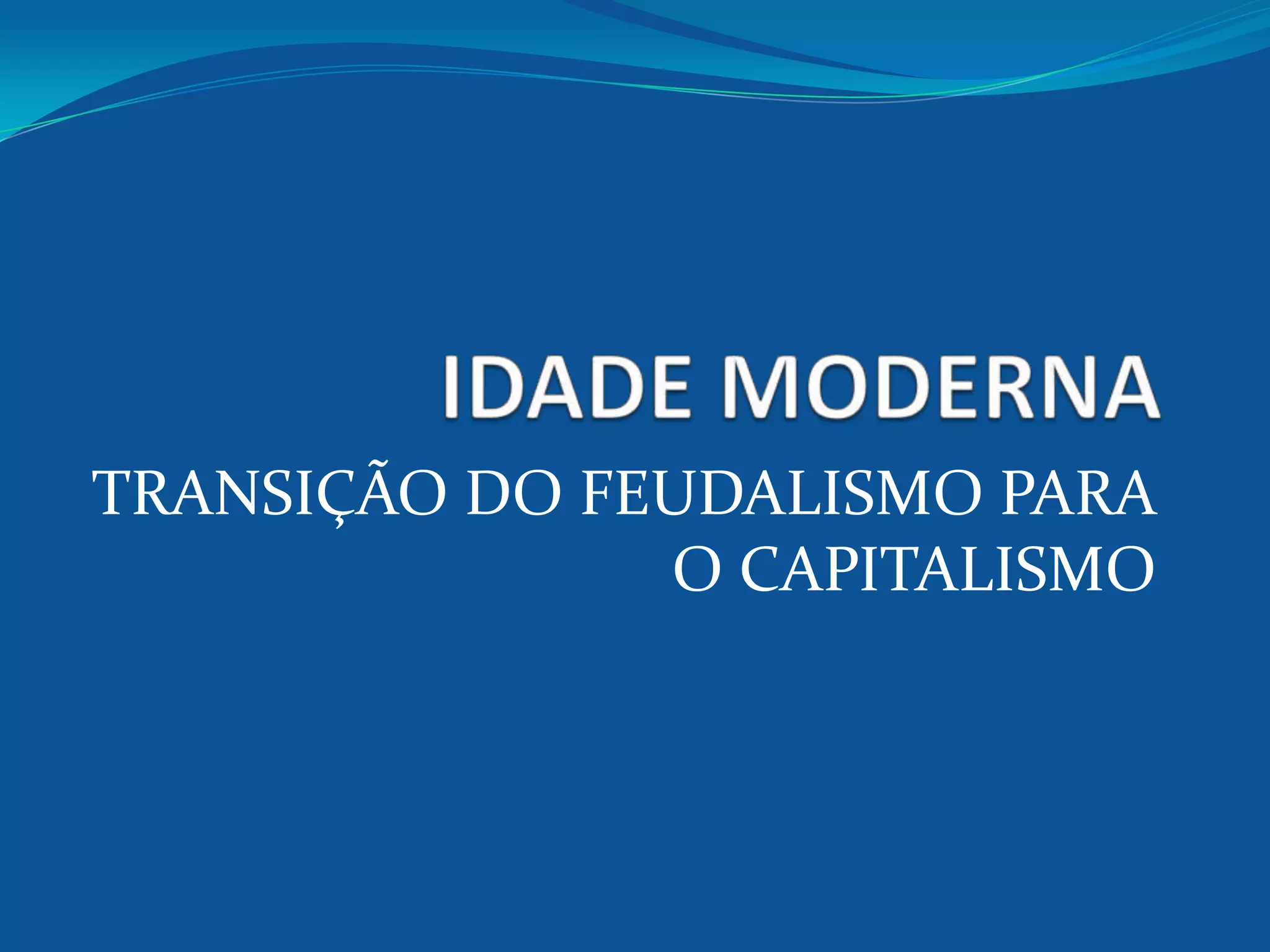 O documento descreve a transição do feudalismo para o capitalismo na Europa, com a crise do sistema feudal a partir do século XIII levando ao renascimento do comércio e formação das monarquias nacionais. Fatores como o crescimento populacional, avanços agrícolas e pestes enfraqueceram o feudalismo, ao passo que surgiram burgos e cidades comercializando mercadorias. Portugal, Espanha, França e Inglaterra consolidaram-se como nações sob monarcas absolutos.