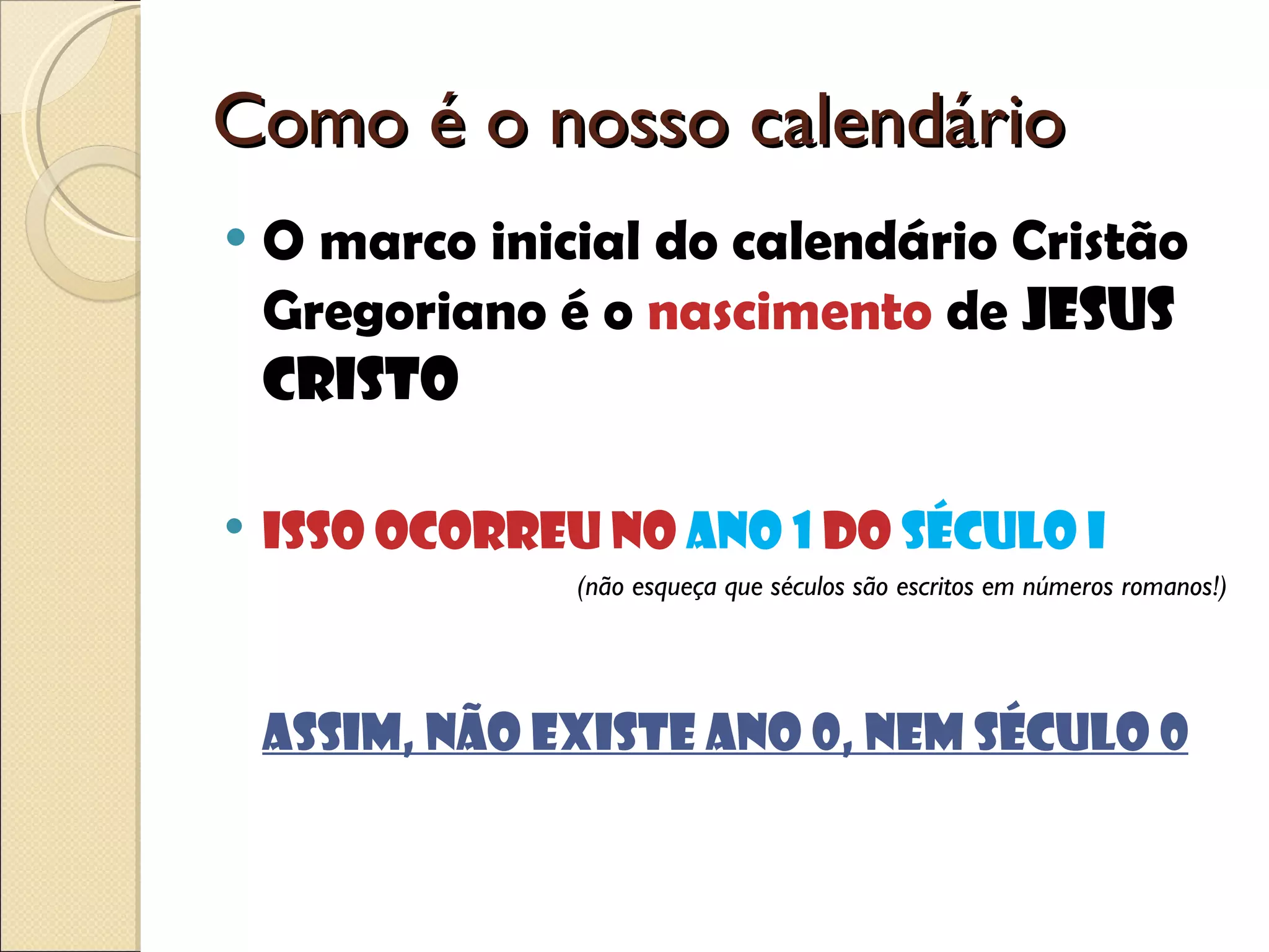 O documento explica como calcular o ano inicial de cada século no calendário gregoriano, começando com o nascimento de Jesus no ano 1 d.C. (1) Todo século tem 100 anos e começa com um ano que termina em "01"; (2) Para calcular o ano inicial, diminua 1 do número do século e acrescente "01"; (3) Exemplos incluem século I (ano 1), século XIV (ano 1301) e século XXI (ano 2001).