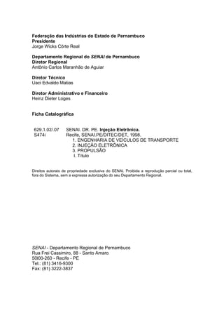 O documento descreve o funcionamento do sistema de injeção eletrônica em veículos, incluindo seus principais componentes como a unidade de controle eletrônico, sensores e atuadores. Também aborda estratégias do sistema para controlar a emissão de gases poluentes e a ignição, além de explicar como mede a quantidade de ar e combustível injetado.