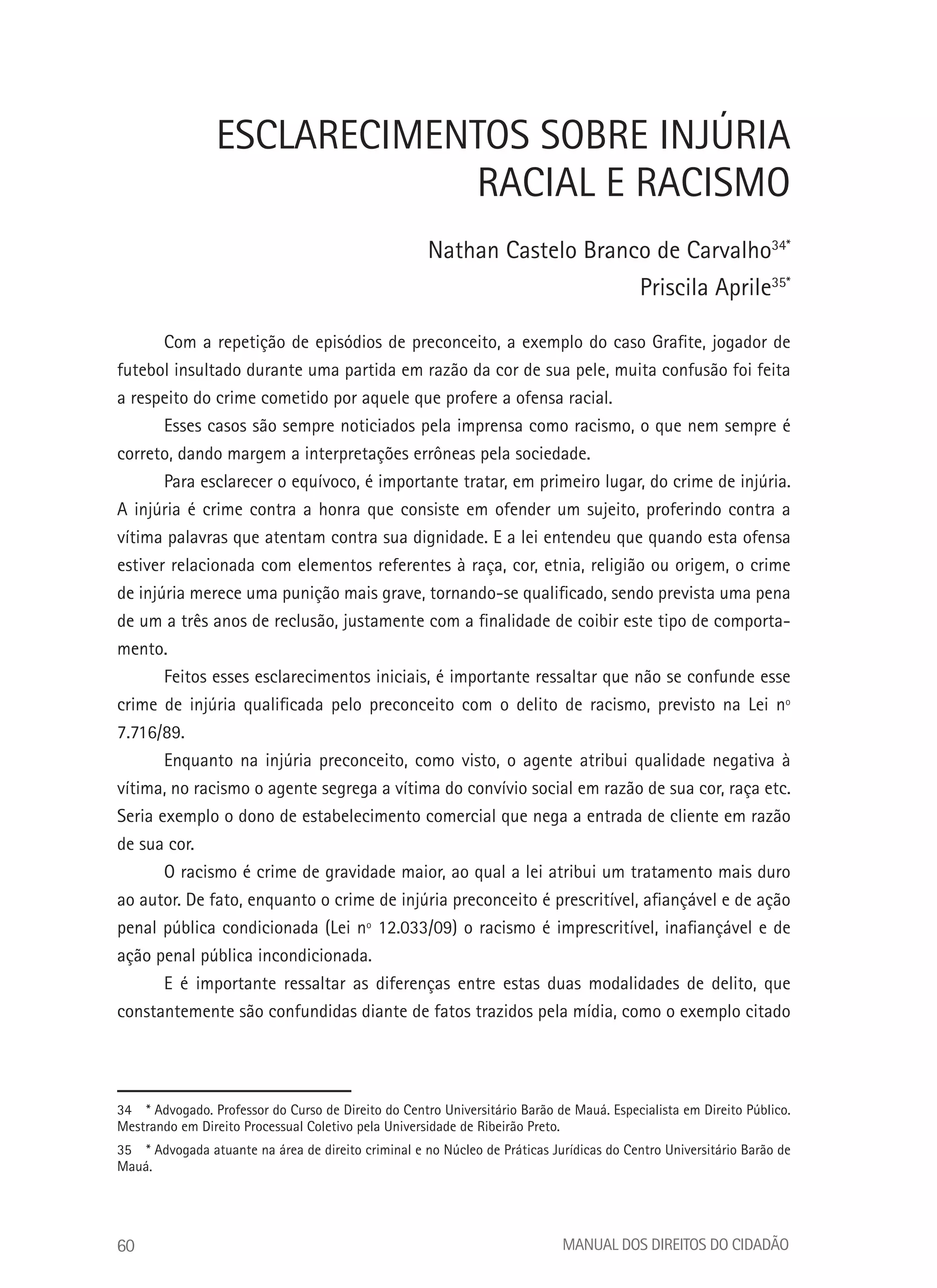 O documento esclarece as diferenças entre injúria racial e racismo. A injúria racial é um crime contra a honra que envolve ofensas relacionadas a raça e merece pena mais grave. O racismo segrega a vítima da sociedade e tem pena ainda maior. Embora os termos sejam frequentemente confundidos, a lei trata cada um de forma distinta.